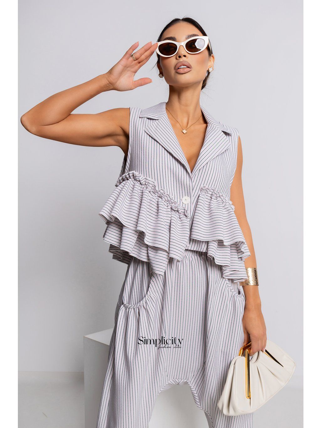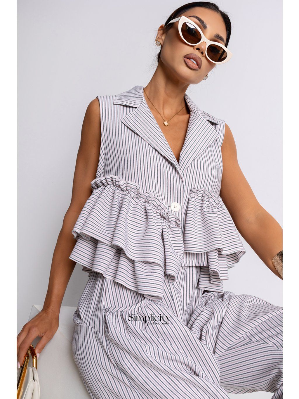 Zvislé pruhy – opticky zoštíhľujú postavu a dodávajú celkovému vzhľadu moderný nádych. Blúzka je vyrobená z ľahkej, vzdušnej látky, ktorá pohodlne splýva a hodí sa ku každodenným aj elegantnejším outfitom. Krásne sa hodí k nohaviciam s rovnakým vzorom a vytvára módny celok, alebo k jednoduchým nohaviciam či sukni. Skombinujte ju so sandálmi na podpätku alebo minimalistickými doplnkami pre elegantný letný vzhľad. Je to perfektná voľba pre ženy, ktoré rady vynikajú decentným, no zároveň výrazným tvarom a oceňujú detaily, ktoré dodávajú ich outfitom charakter.