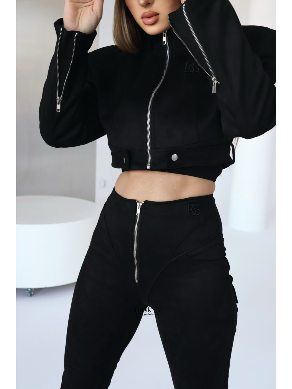 Semišová bunda BG HELL so strieborným zipsom. Bunda má ozdobné prešívanie, vysoké vypchávky na ramenách a logo BG na prednej strane. Zipsy na rukávoch. Ozdobné patentné gombíky v spodnej časti a stojačik. Bunda je podšitá.
