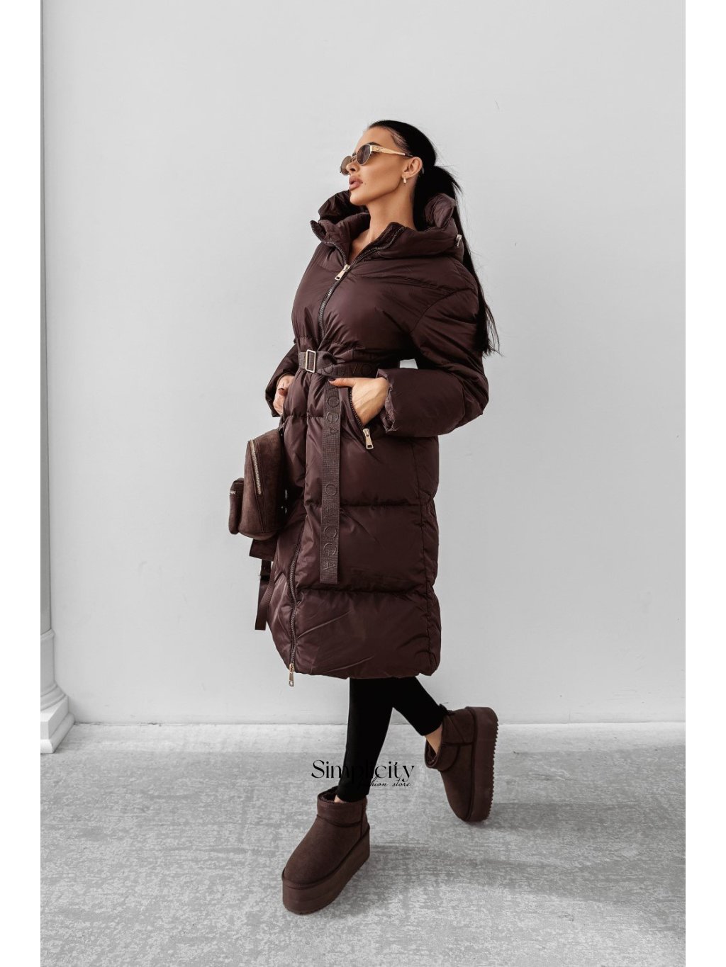 Dlhá prešívaná bunda s kapucňou, ktorá chráni pred chladom. Vybavená opaskom, ktorý zdôrazňuje ženskú siluetu. Zdobená logom na prednej strane.