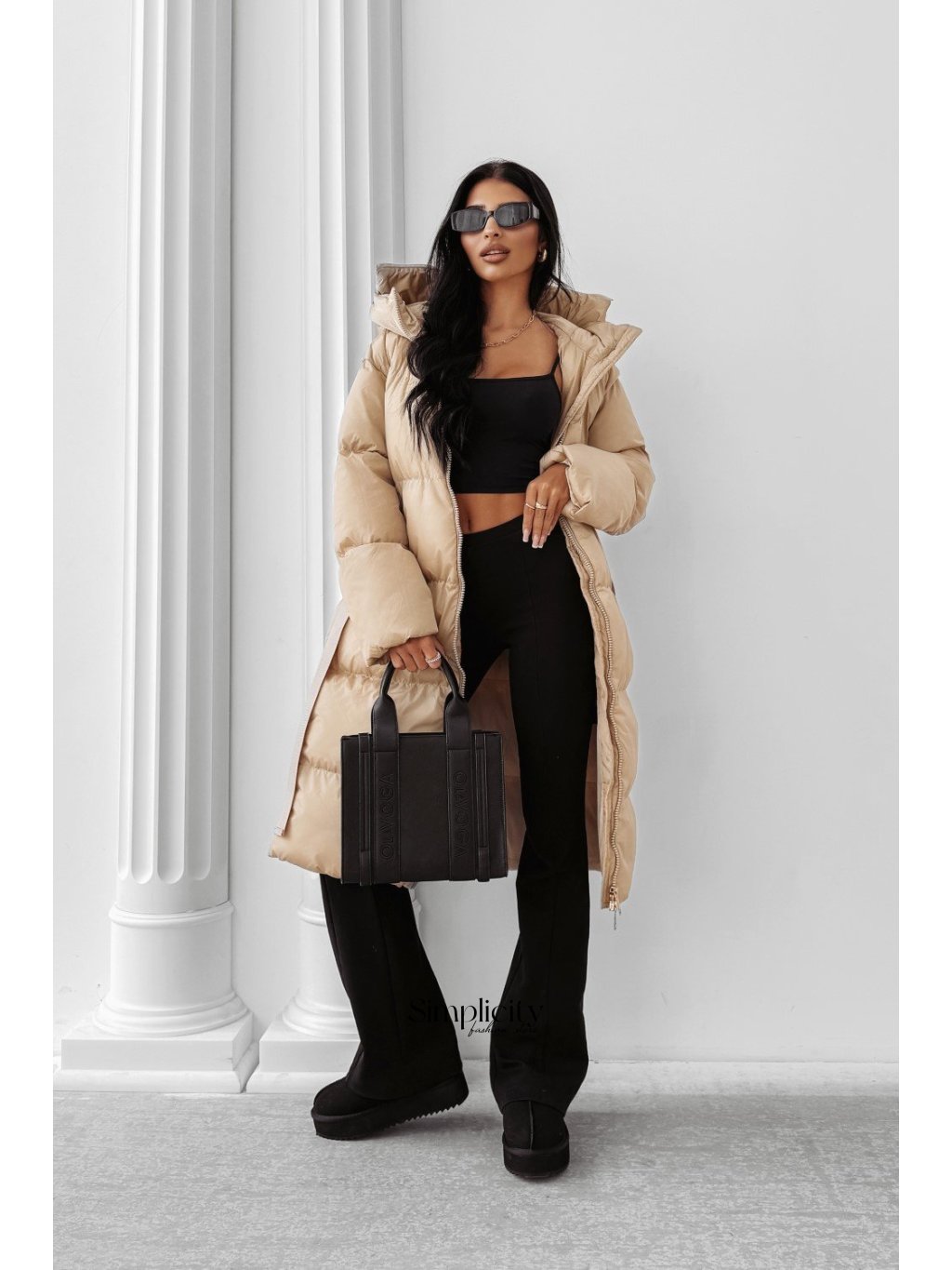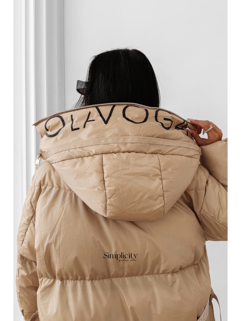 Dlhá prešívaná bunda s kapucňou, ktorá chráni pred chladom. Vybavená opaskom, ktorý zdôrazňuje ženskú siluetu. Zdobená logom na prednej strane.