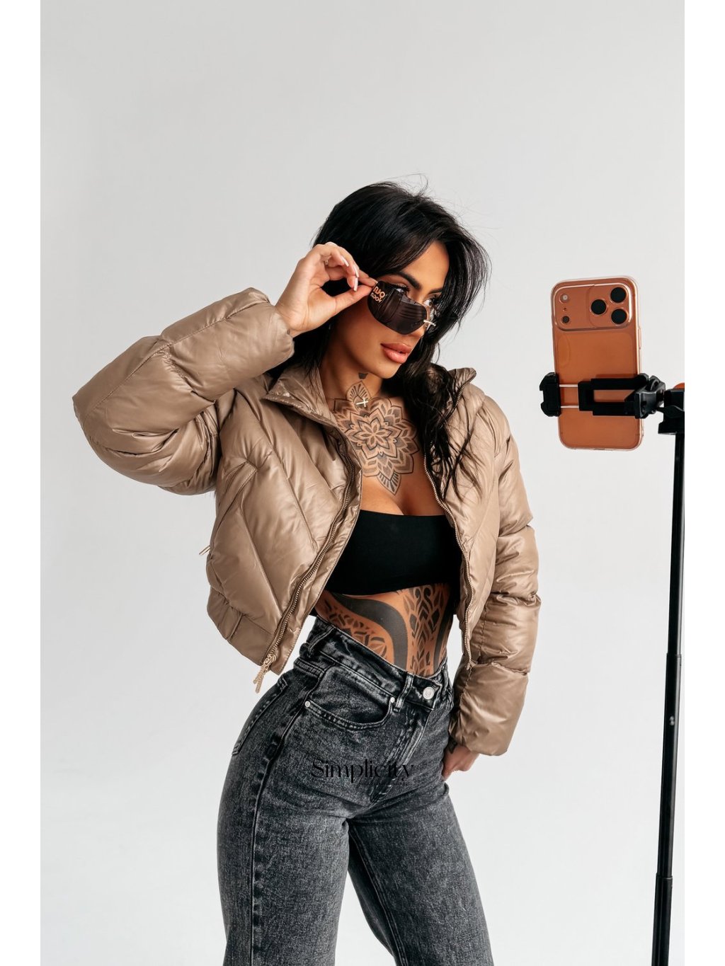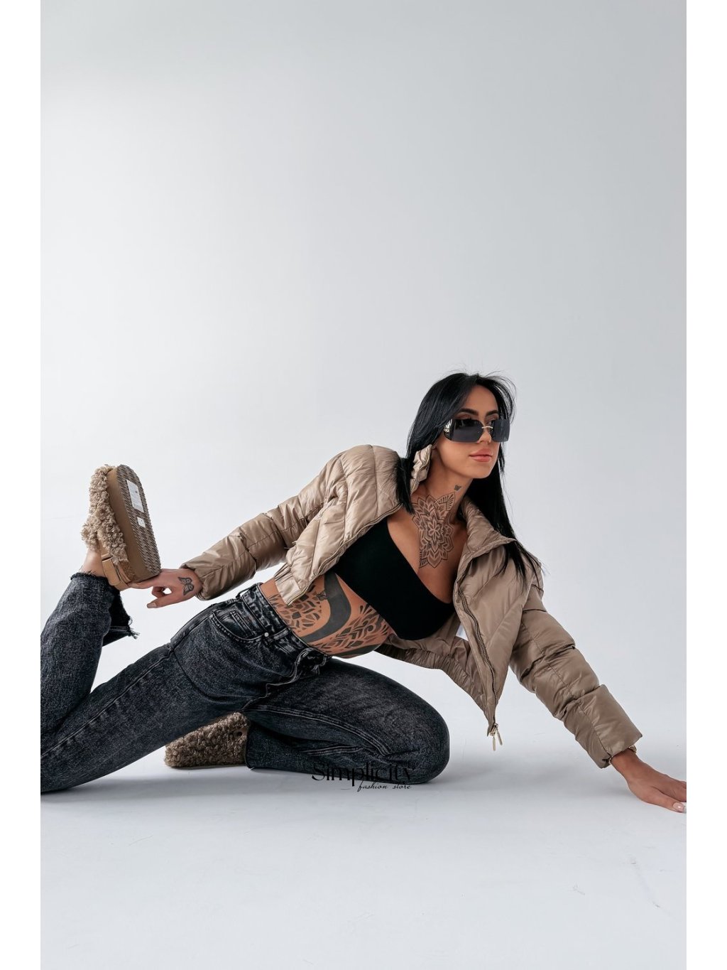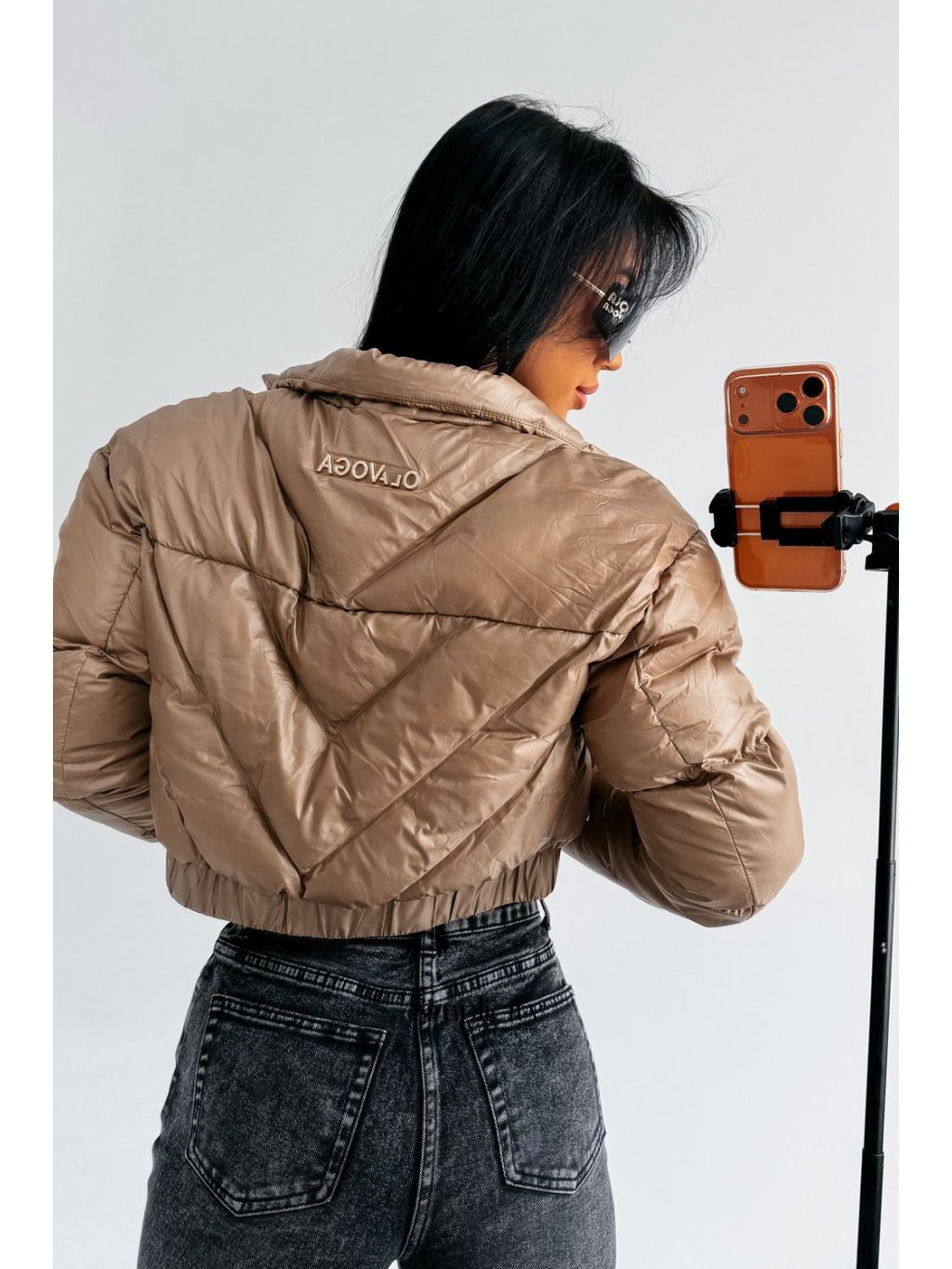 Moderná, mierne skrátená prešívaná bunda z hladkého, mierne lesklého materiálu. S pevným, zlatým, značkovým zipsom. S vysokým stojačikom, elastickými okrajmi. Zdobená jemným zlatým logom OLAVOGA na chrbte. S praktickými vreckami na zips.