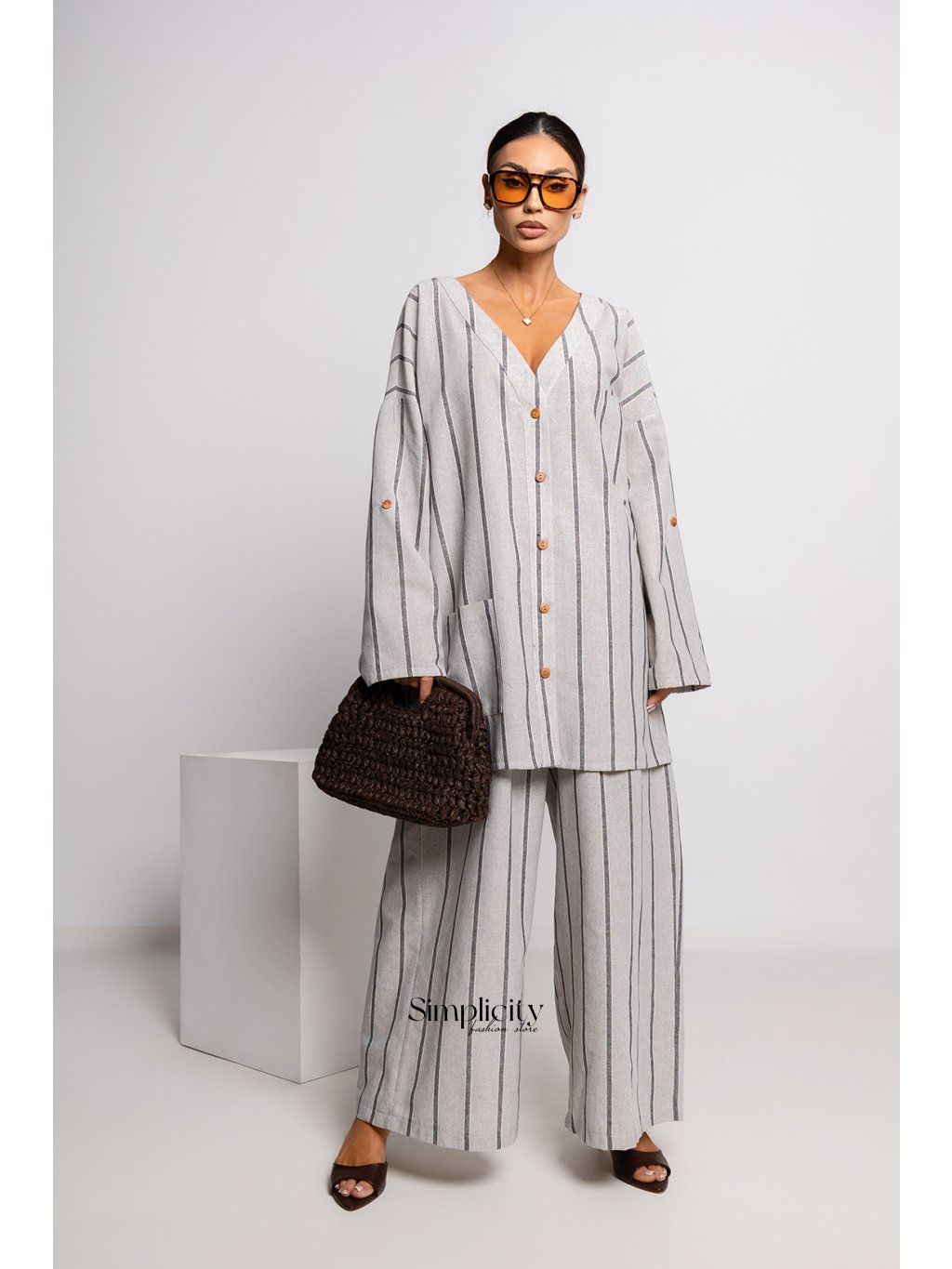 Stylowa koszula o nowoczesnym, minimalistycznym charakterze, idealna dla kobiet ceniących wygodę i elegancję w codziennym wydaniu. Model wykonany z lekkiej, przewiewnej tkaniny w subtelny, pionowy prążek, który optycznie wysmukla sylwetkę.