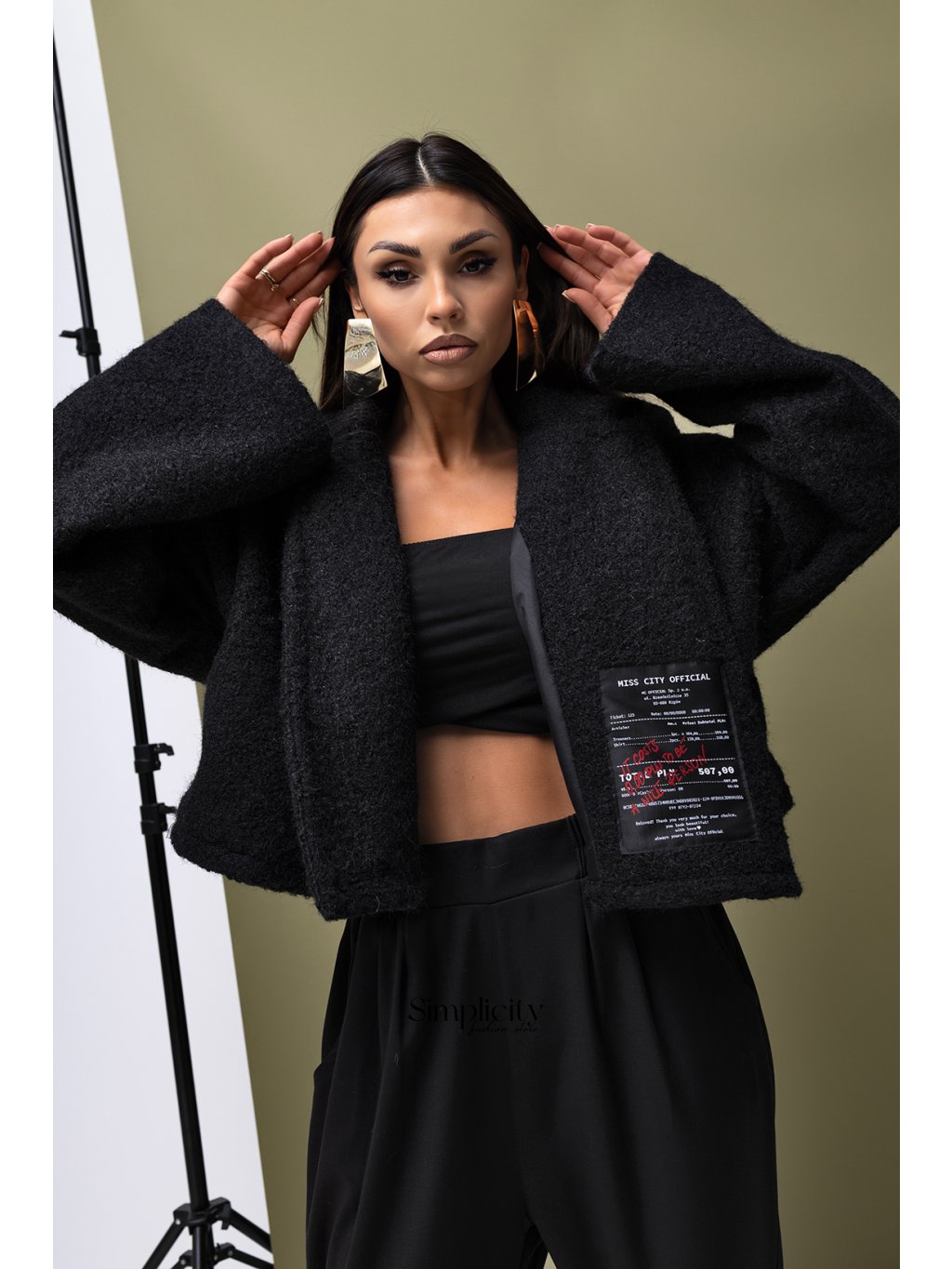 Plášť s krátkym, mierne oversized strihom, navrhnutý v modernom, mestskom štýle. Vyrobený z mäkkej, príjemnej látky na dotyk s výraznou, mierne "chlpatou" textúrou, dodáva módny nádych.