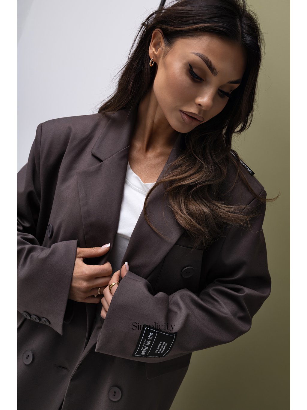 Široké ramená a zapínanie na dva gombíky vytvárajú výraznú siluetu, zatiaľ čo veľké vrecká a nášivka na rukáve dodávajú kabátu originalitu a charakter.