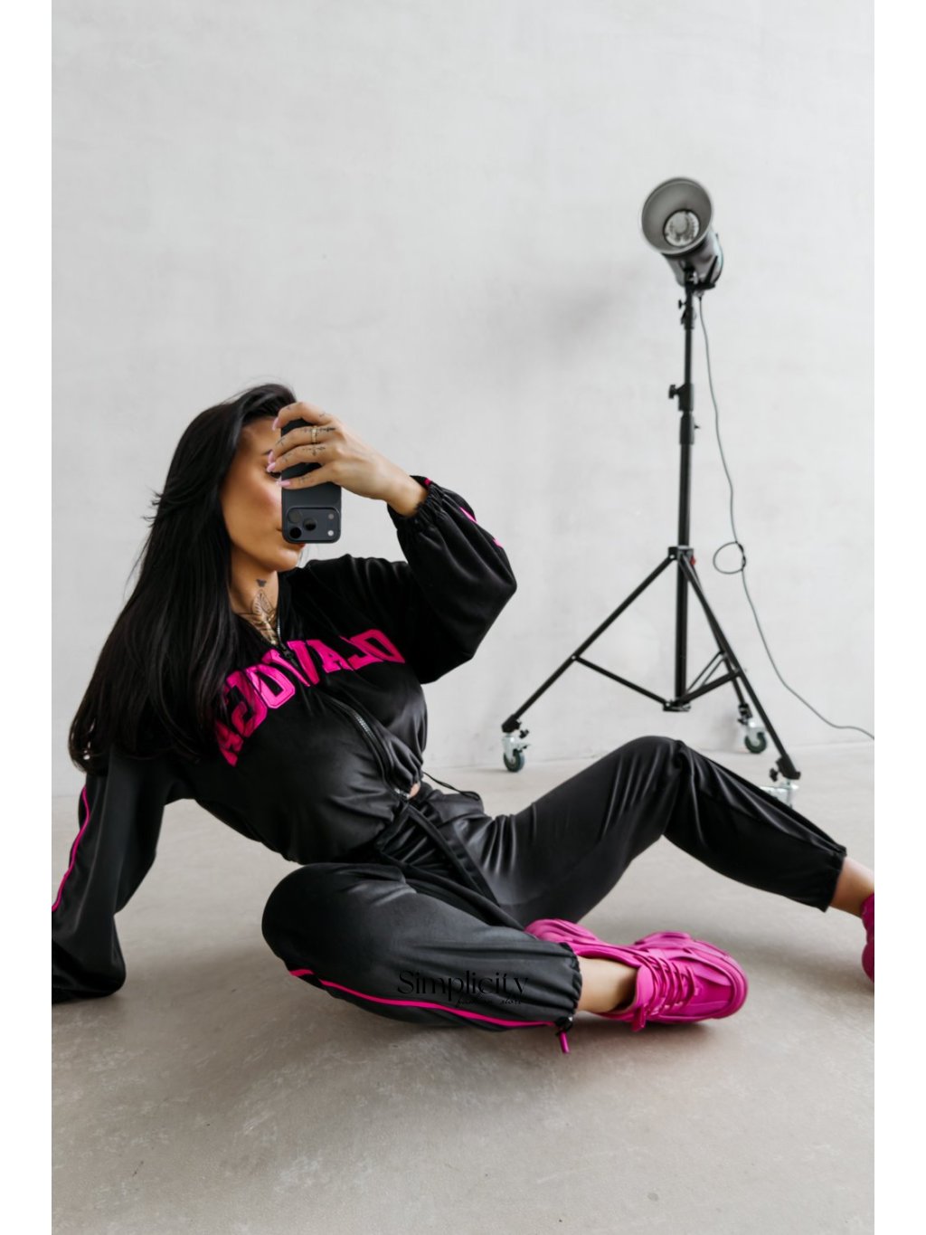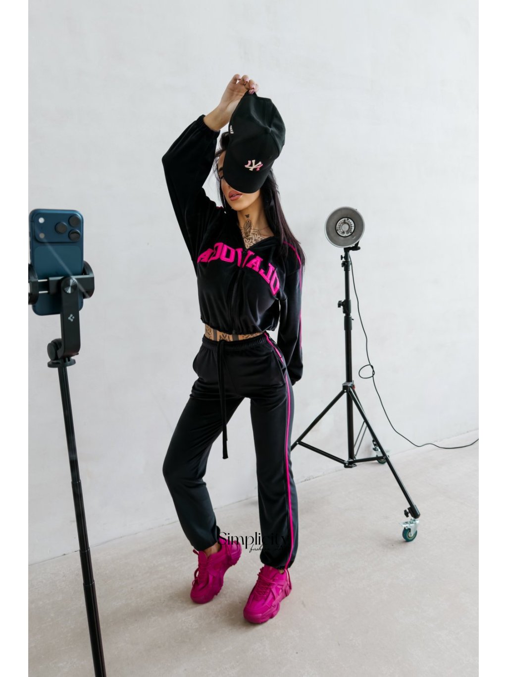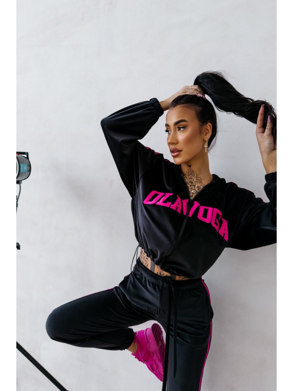 Vrchný diel (sveter): Skrátený, mierne oversized model so zipsom po celej dĺžke. Kapucňa a spadnuté ramená dodávajú ležérny vzhľad, zatiaľ čo kontrastné bočné pruhy pozdĺž rukávov dodávajú dynamický nádych. Predná časť zdobí výrazná vyšívaná aplikácia OLAVOGA .