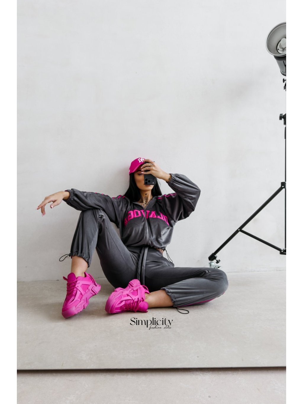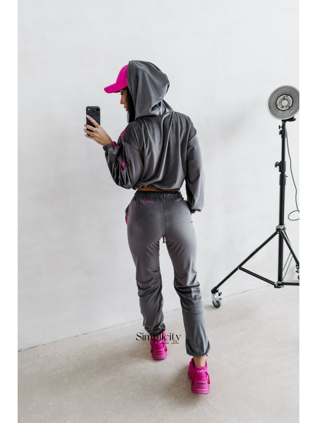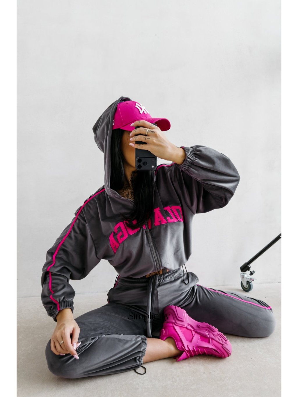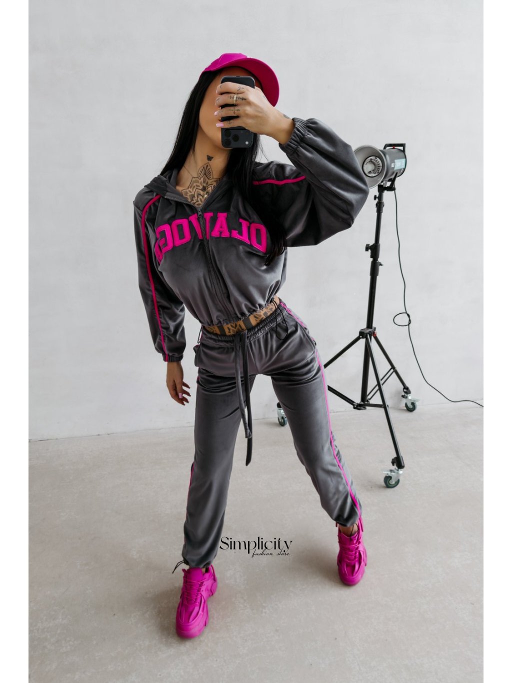Vrchný diel (sveter): Skrátený, mierne oversized model so zipsom po celej dĺžke. Kapucňa a spadnuté ramená dodávajú ležérny vzhľad, zatiaľ čo kontrastné bočné pruhy pozdĺž rukávov dodávajú dynamický nádych. Predná časť zdobí výrazná vyšívaná aplikácia OLAVOGA .