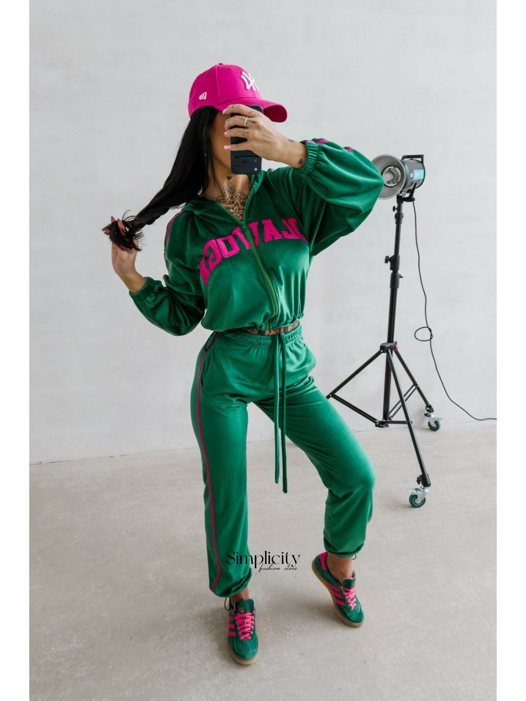 Vrchný diel (sveter): Skrátený, mierne oversized model so zipsom po celej dĺžke. Kapucňa a spadnuté ramená dodávajú ležérny vzhľad, zatiaľ čo kontrastné bočné pruhy pozdĺž rukávov dodávajú dynamický nádych. Predná časť zdobí výrazná vyšívaná aplikácia OLAVOGA .