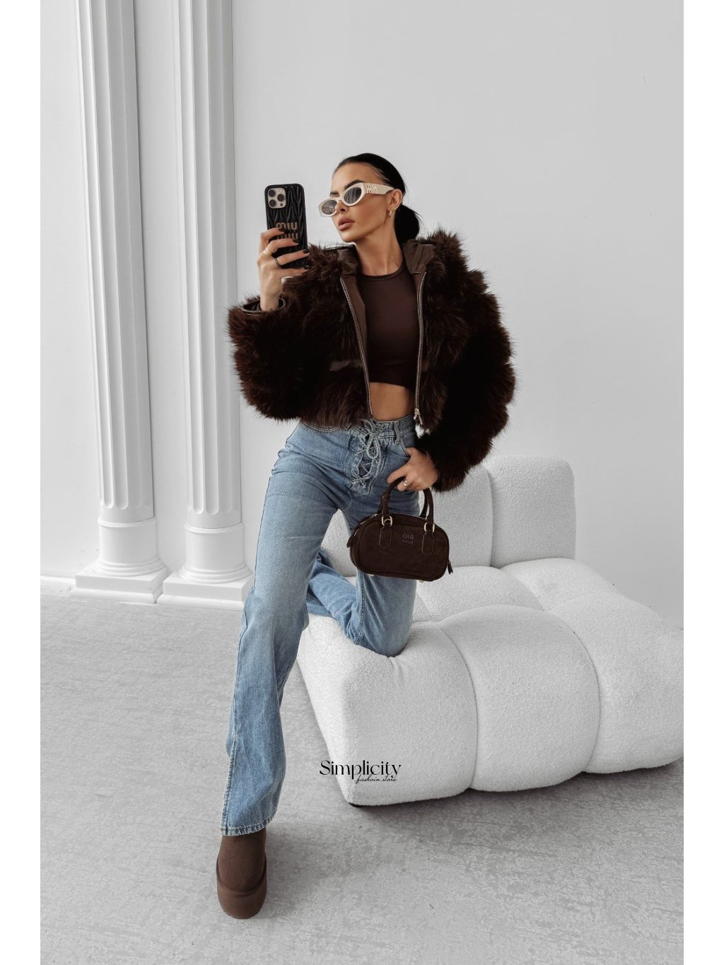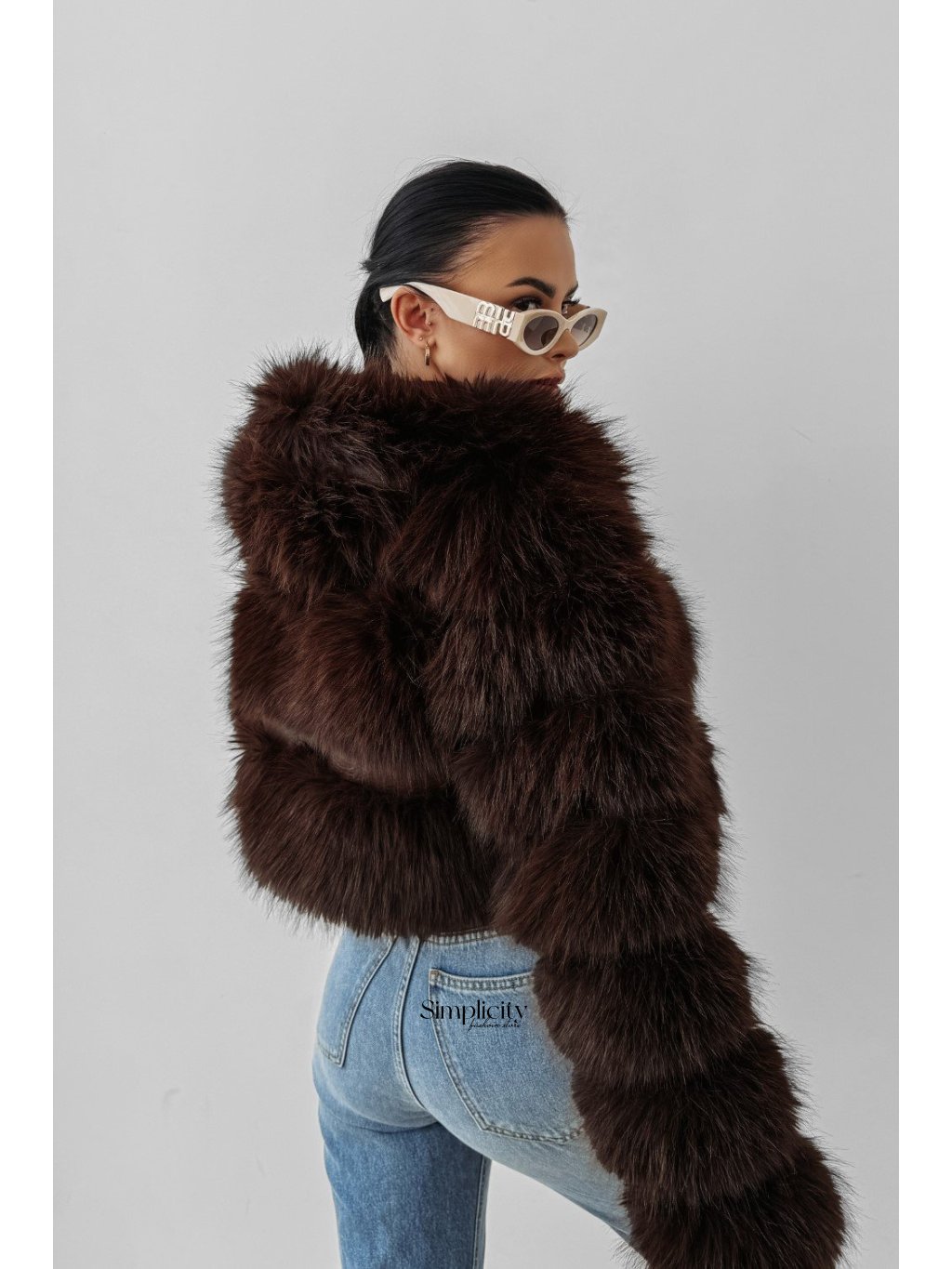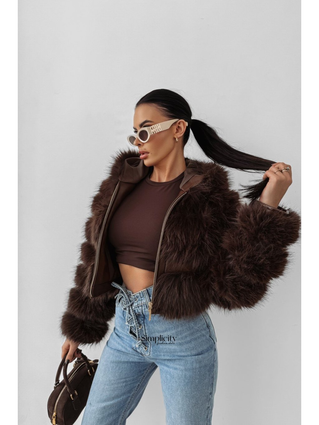 Módny, krátky kabát z umelej kožušiny v dámskom prevedení.