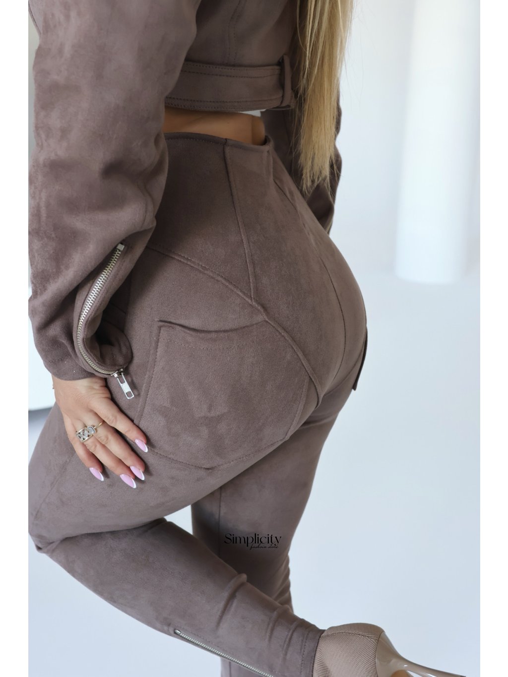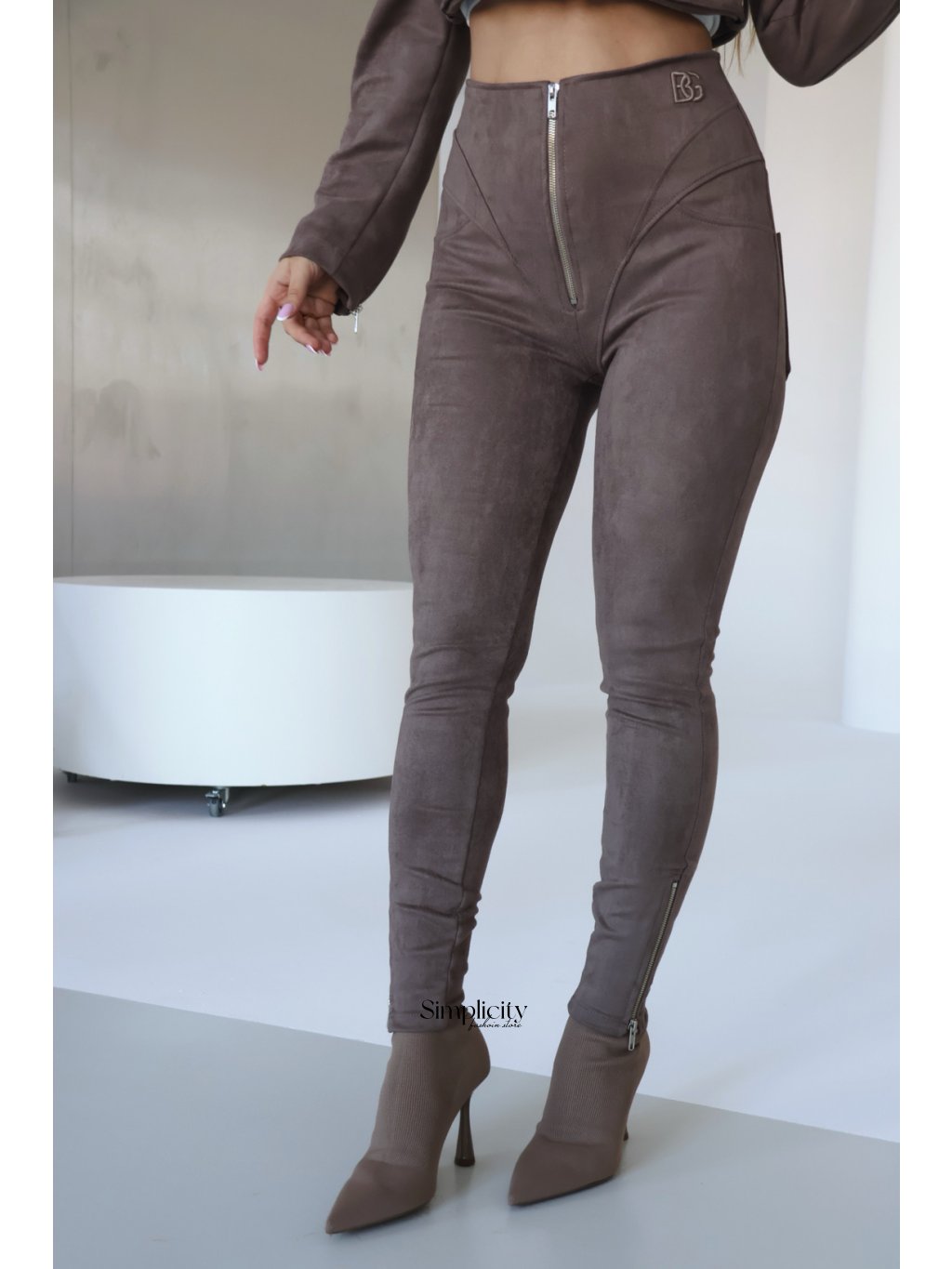 Dámske semišové legíny BG BUTTON. Vysoký pás, zapínanie na zips vpredu a na bokoch. Ozdobné prešívanie vpredu a tvarujúci zadný diel „push-up“. Zadné vrecká. Značka BG vpredu. Modelka na fotografii má na sebe veľkosť XS.