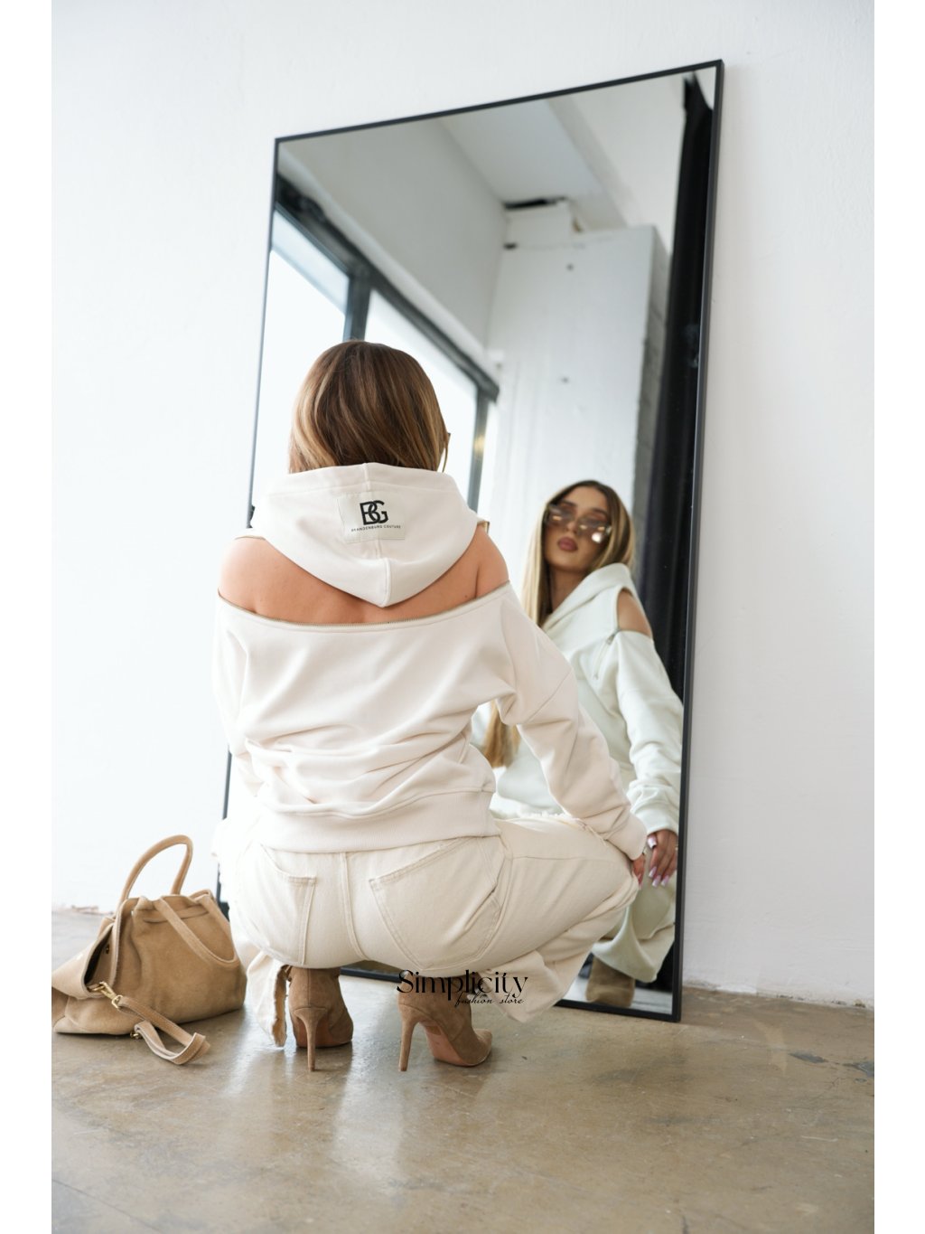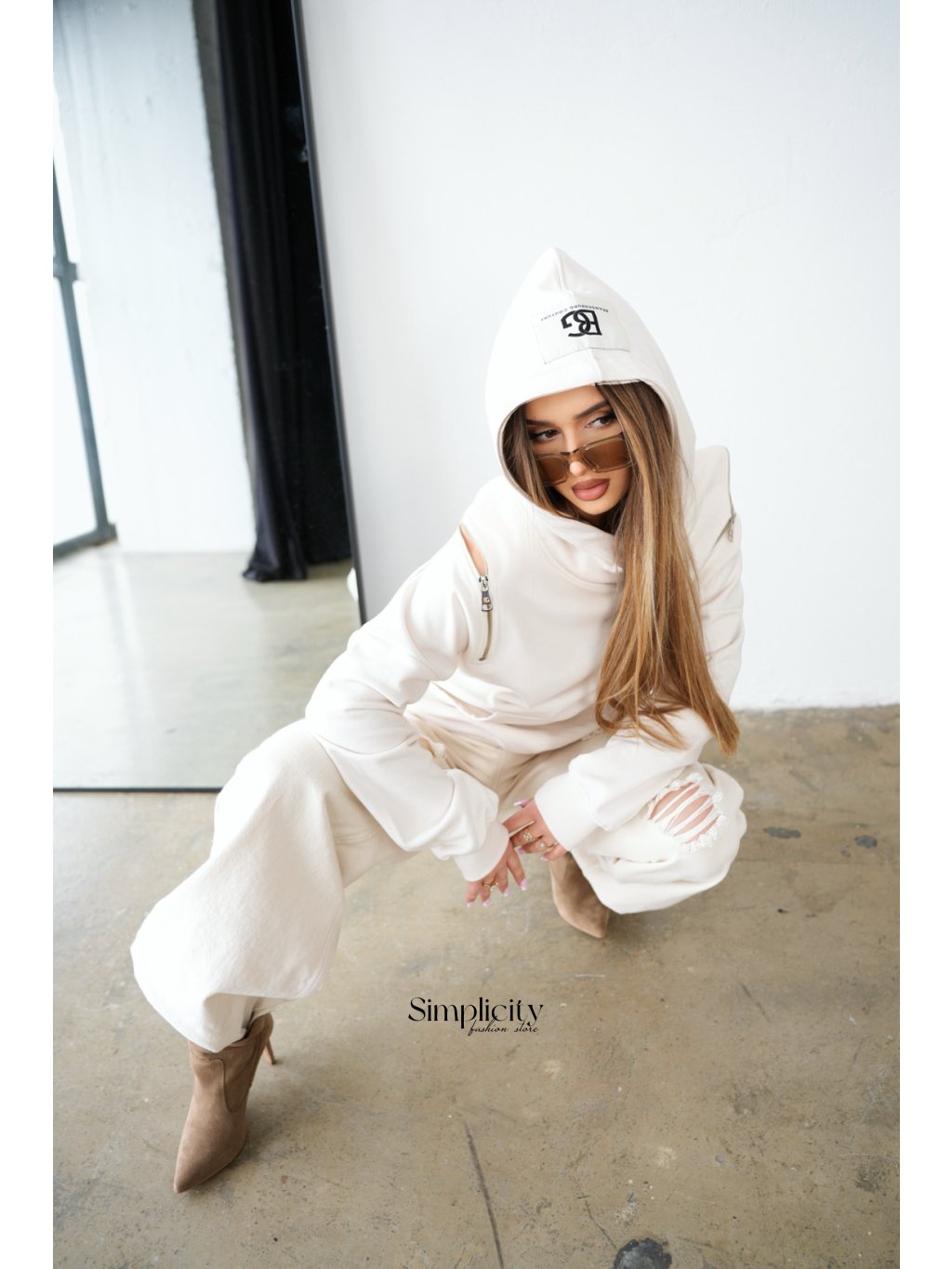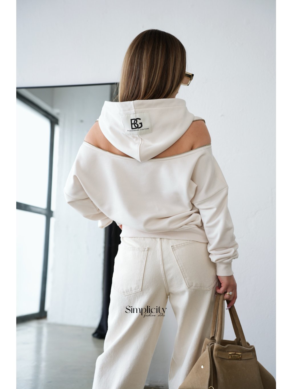 Extravagantná mikina BG BECKY vyrobená z vysoko kvalitnej bavlny bez podšívky. Mikina s kapucňou a nášivkou s logom BG Brandenburg Couture. Ozdobný, odnímateľný dvojitý zips vzadu. Odopnutím sa dá otvotvoriť celé okolie ramien.Získate tak extravagantný kúsok.Zdobené rebrovanými manžetami.