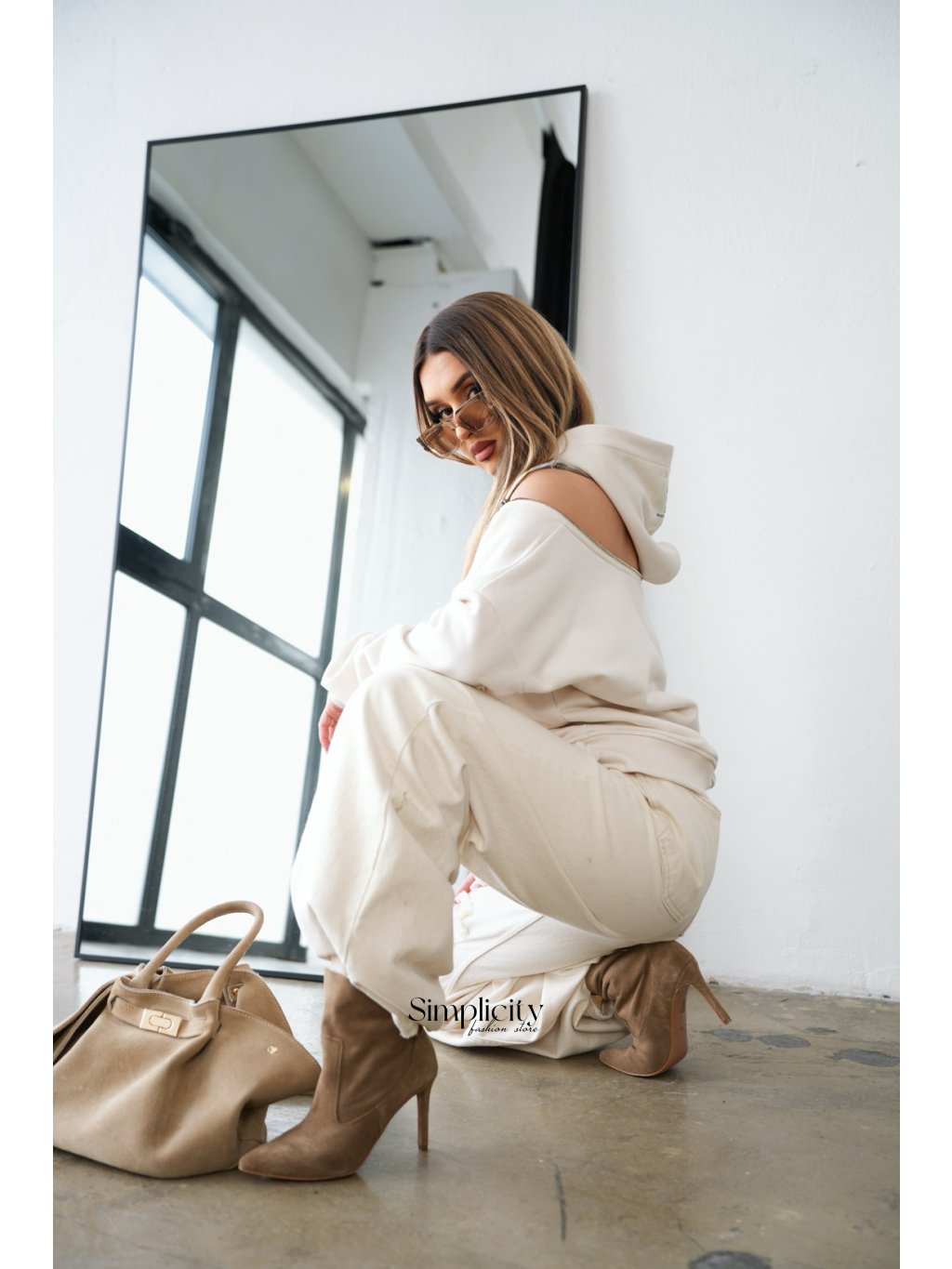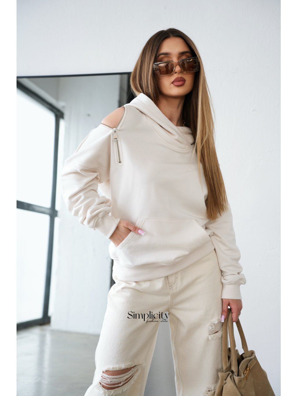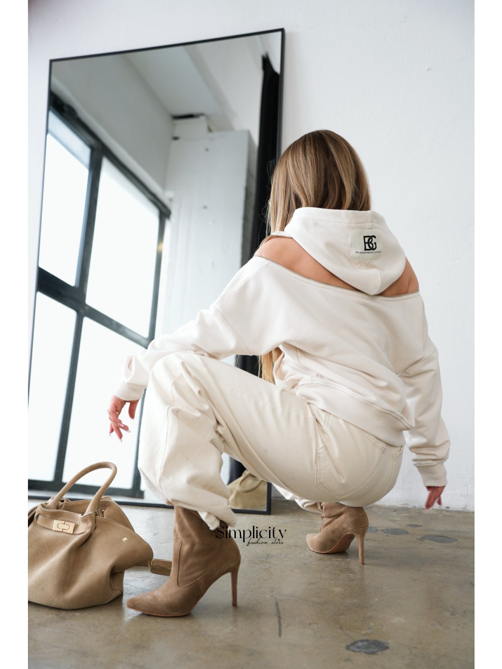 Extravagantná mikina BG BECKY vyrobená z vysoko kvalitnej bavlny bez podšívky. Mikina s kapucňou a nášivkou s logom BG Brandenburg Couture. Ozdobný, odnímateľný dvojitý zips vzadu. Odopnutím sa dá otvotvoriť celé okolie ramien.Získate tak extravagantný kúsok.Zdobené rebrovanými manžetami.