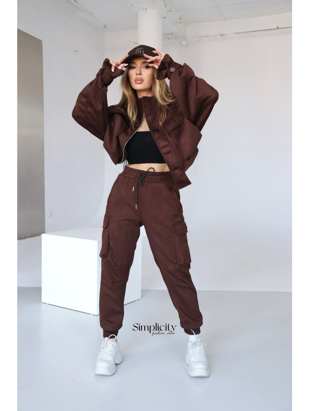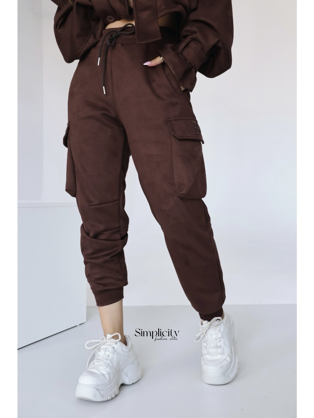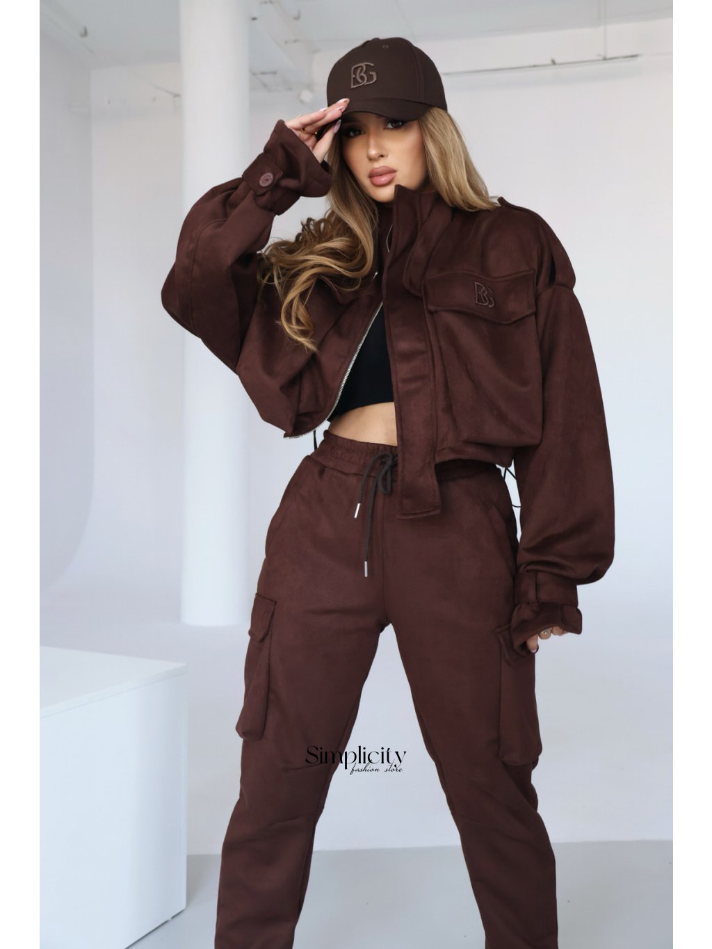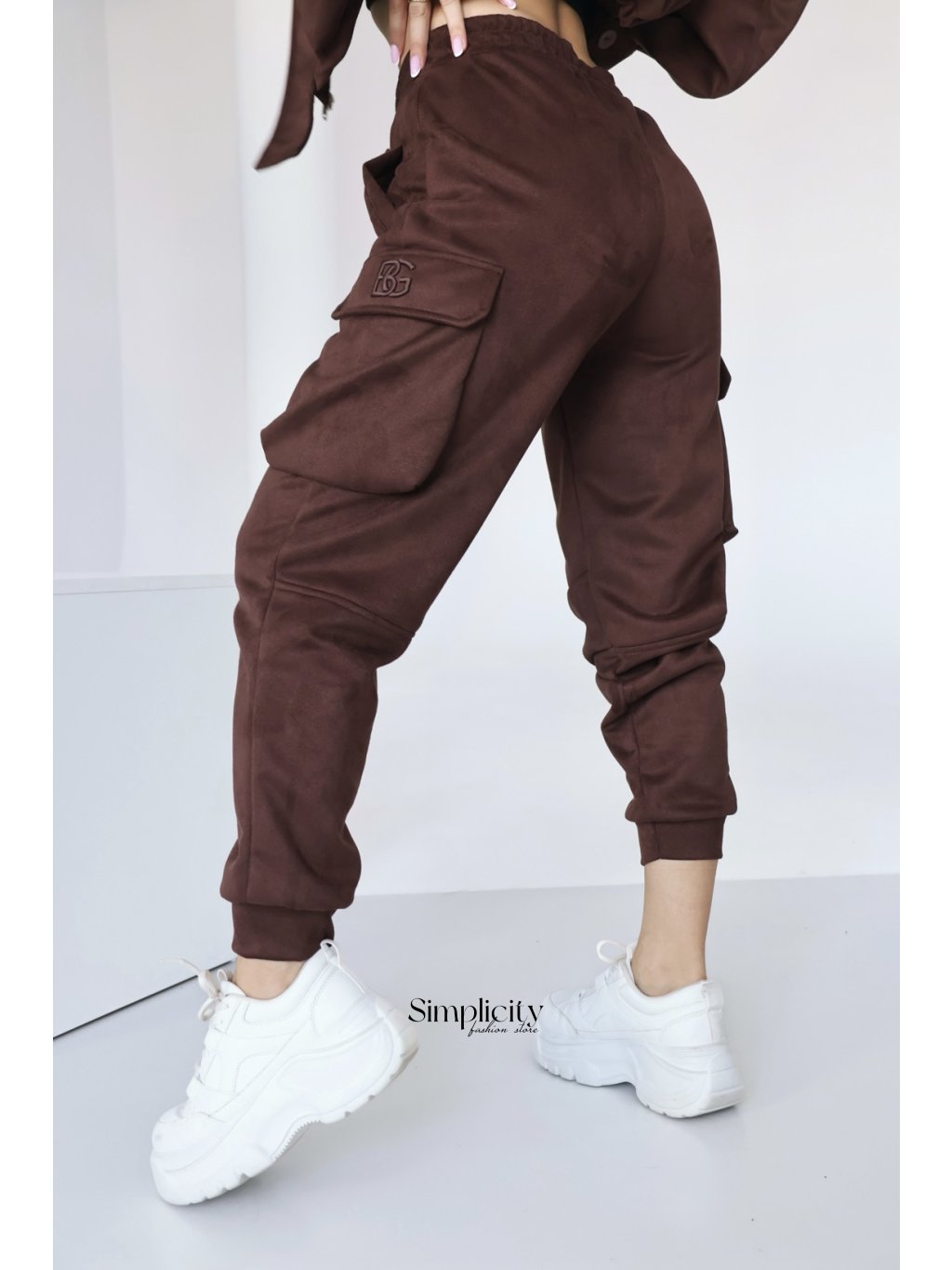Dámske semišové nohavice BG ARMY. Vysoký pás. Ozdobné bočné vrecká. Manžety s manžetami. Logo BG na klope vrecka. Modelka na fotografii má na sebe veľkosť S.