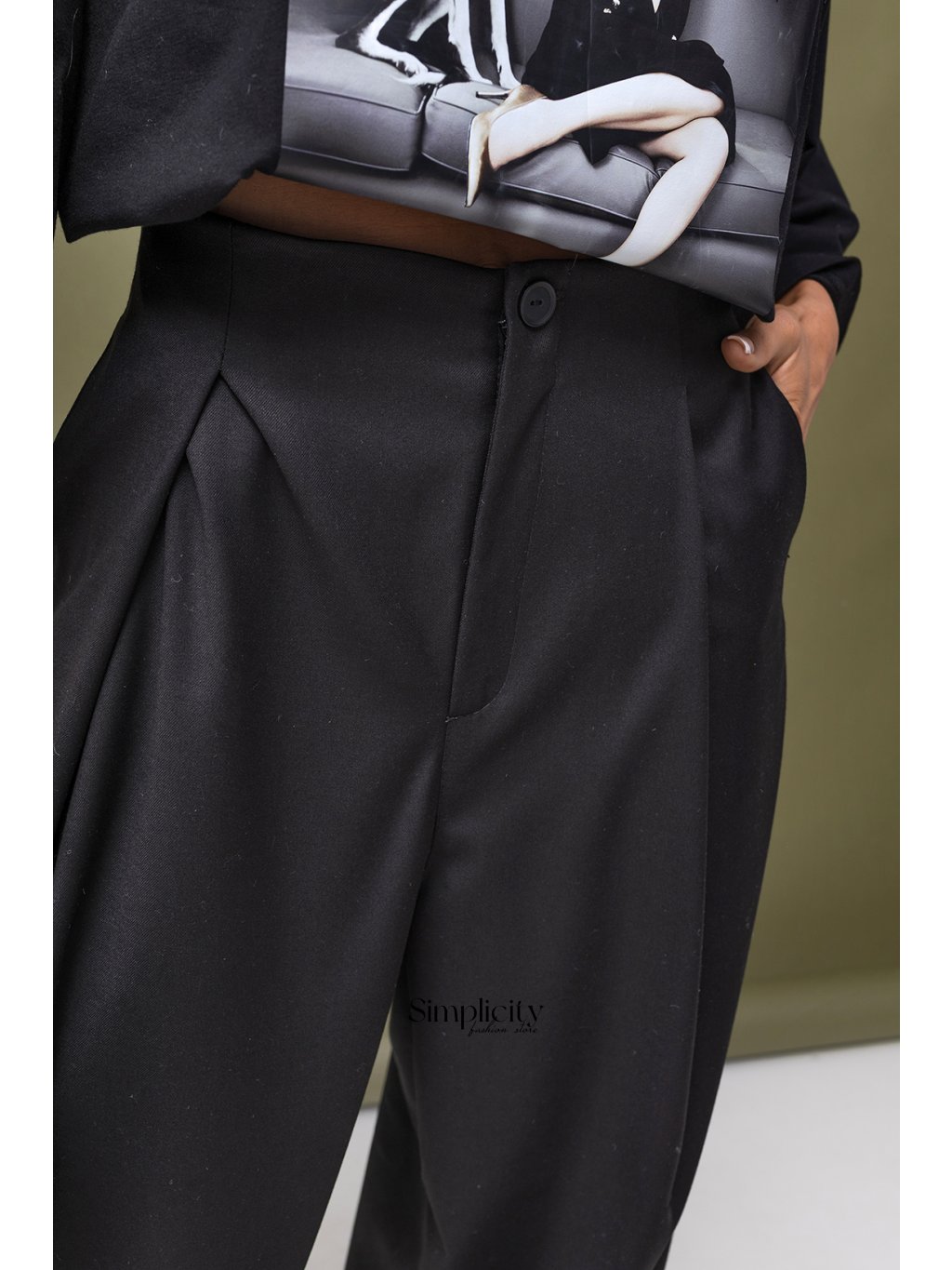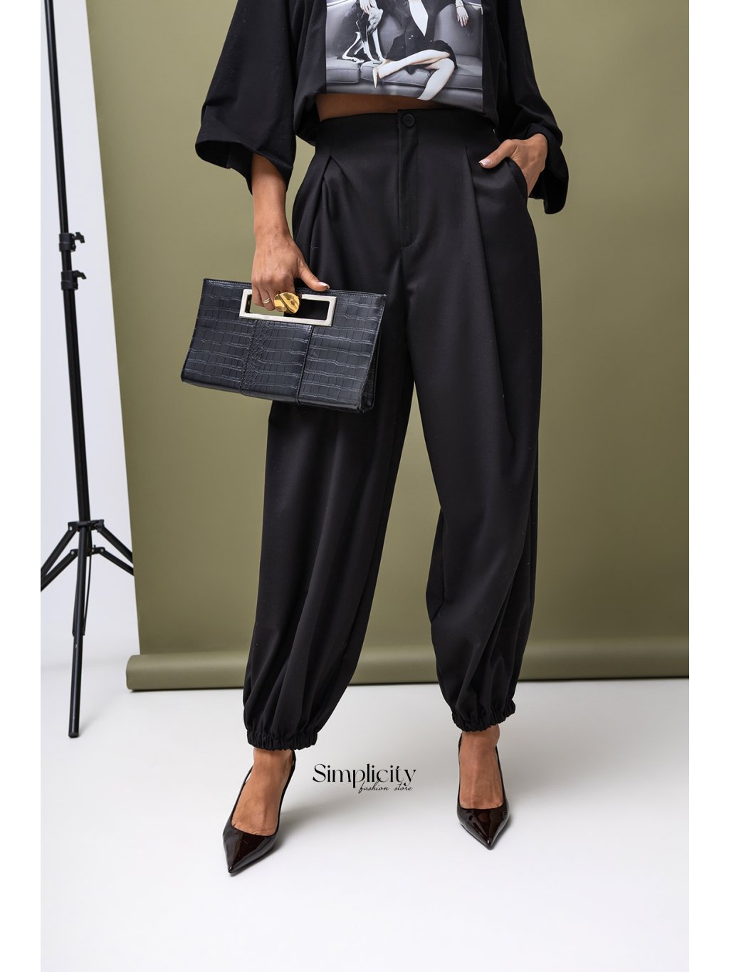 Nohavice balónového strihu a širokými nohavicami s výraznými riaseniami na leme, vyrobené z vysoko kvalitnej látky s jemným leskom, sú elegantnou voľbou, ktorá kombinuje pohodlie a moderný štýl.