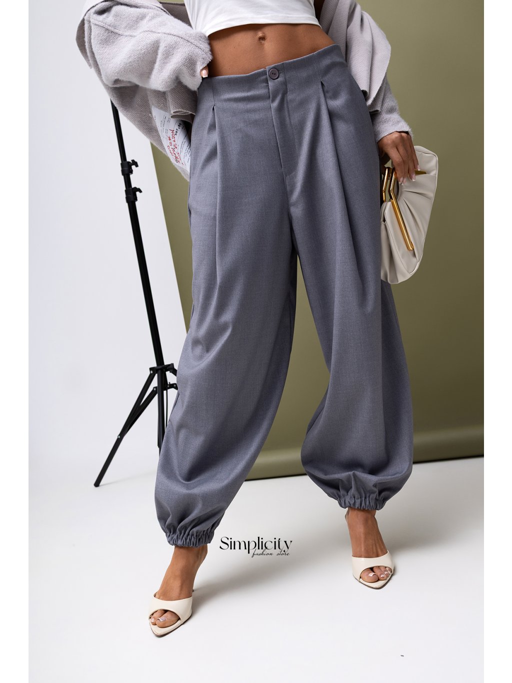 Nohavice balónového strihu a širokými nohavicami s výraznými riaseniami na leme, vyrobené z vysoko kvalitnej látky s jemným leskom, sú elegantnou voľbou, ktorá kombinuje pohodlie a moderný štýl.