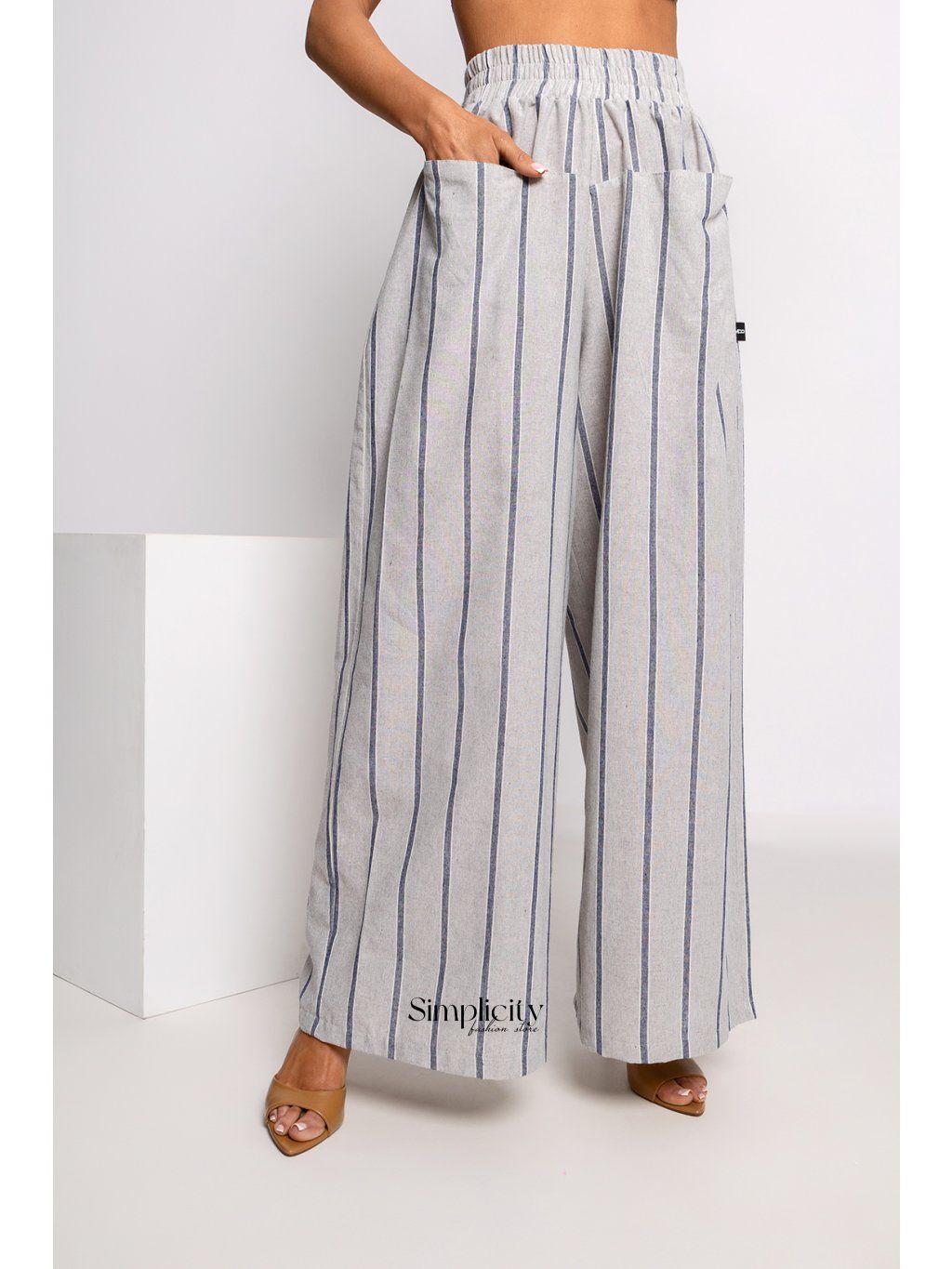 Zvislý pruhovaný vzor opticky predlžuje nohy a zoštíhľuje siluetu, vďaka čomu je tento štýl mimoriadne lichotivý. Vysoký pás s elastickým pásom zaručuje perfektné strihanie a pohodlné nosenie bez akéhokoľvek sťahovania. Ďalšou výhodou sú praktické, hlboké bočné vrecká, ktoré zvyšujú funkčnosť nohavíc a zdôrazňujú ich ležérny charakter. Minimalistický dizajn z nich robí perfektný doplnok k elegantnej košeli aj k jednoduchému topu alebo tričku. Môžu sa nosiť ako súprava alebo ako základ pre mnoho outfitov – od ležérnych až po sofistikovanejšie.