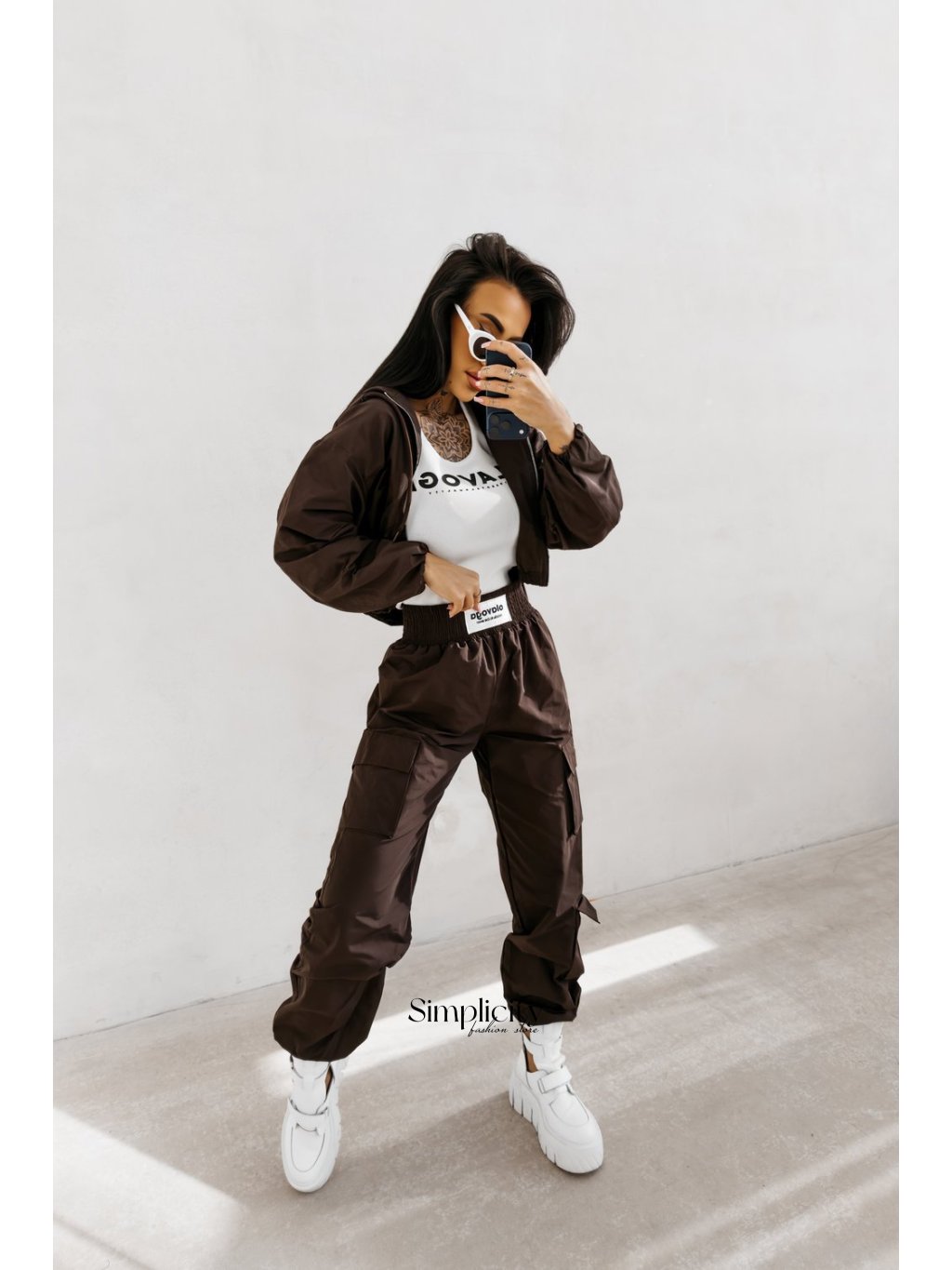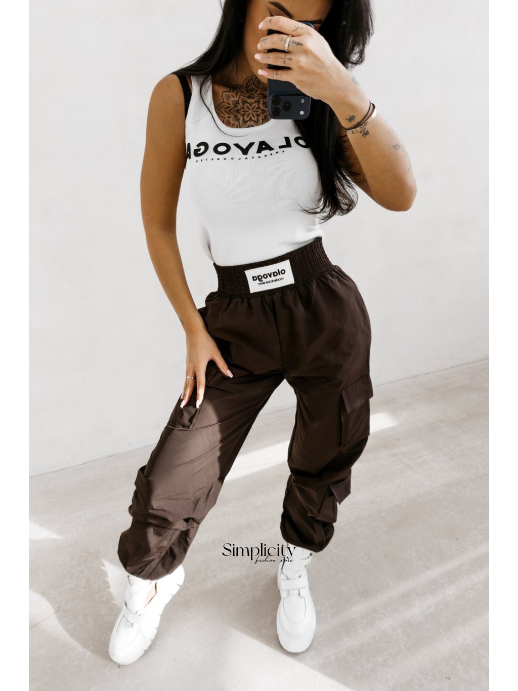 Dizajn: Široké nohavice majú praktické a moderné cargo vrecká . Spodná časť nohavíc je zapínaná na gumičku, ktorá končí v štýle „jogger“, čím zvýrazňuje topánky.