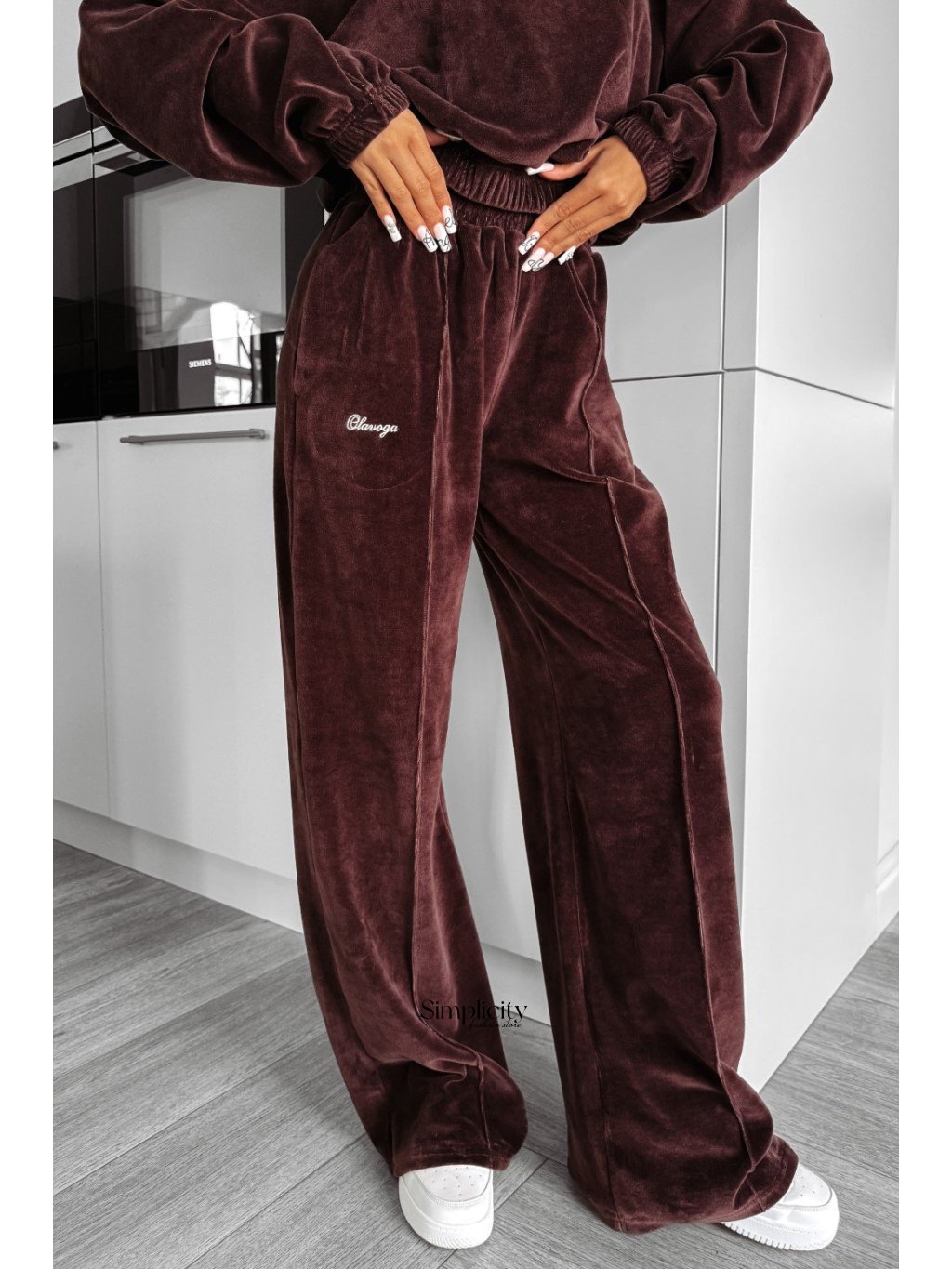 Spodná časť tvoria športové nohavice s vysokým pásom, elastickým pásom, rozšírenými nohavicami a prešívanými detailmi. Predná časť zdobí decentné logo značky.
