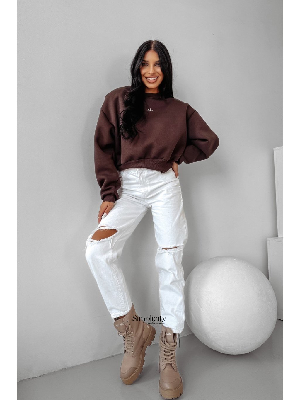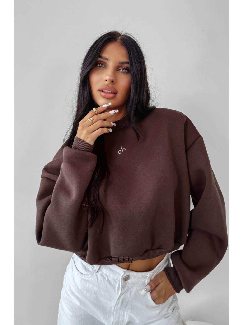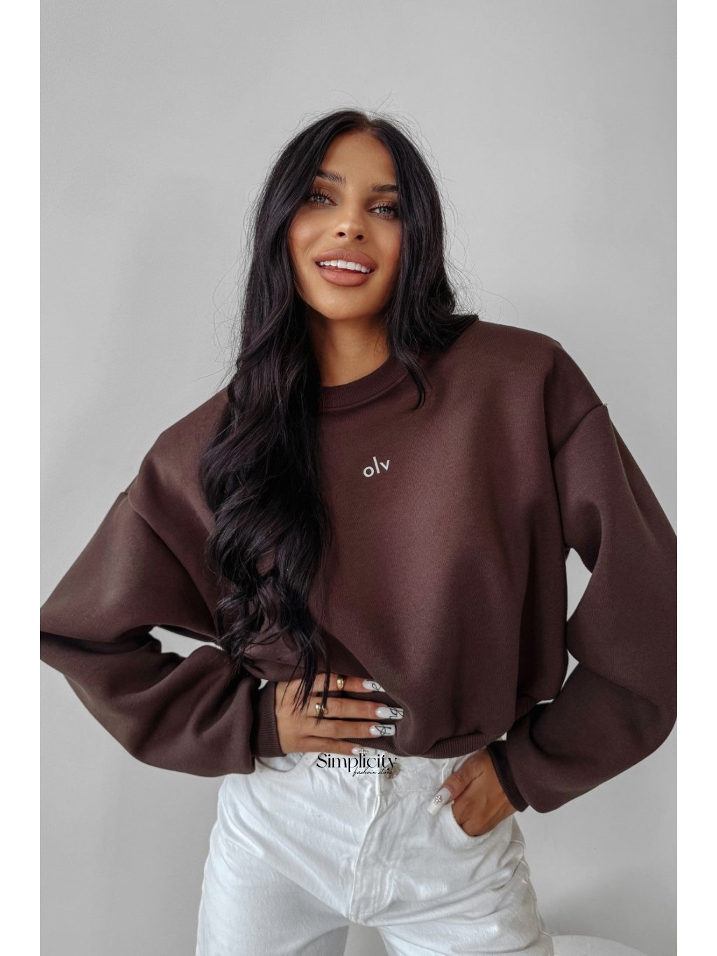 Dámska mikina s kratším strihom bez kapucne vyrobená z vysoko kvalitnej bavlny. Výplň na ramenách jej dodáva ženský, štruktúrovaný vzhľad. Rebrované sedlá na rukávoch a leme zaisťujú perfektný strih. Mikina je zdobená čistým, minimalistickým nápisom "OLV" na hrudi.