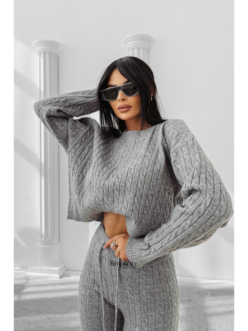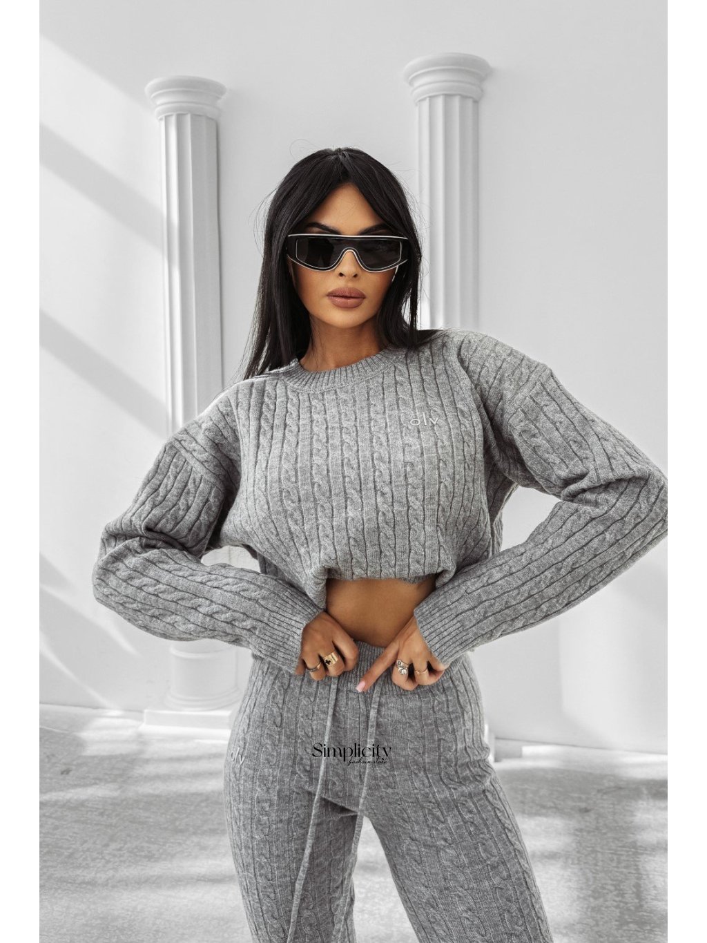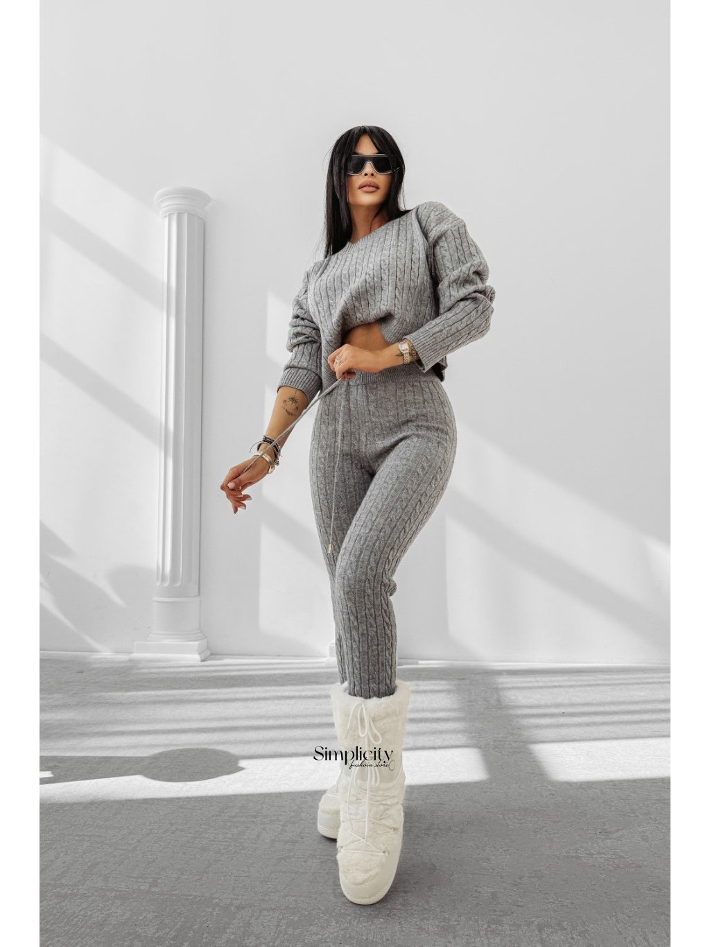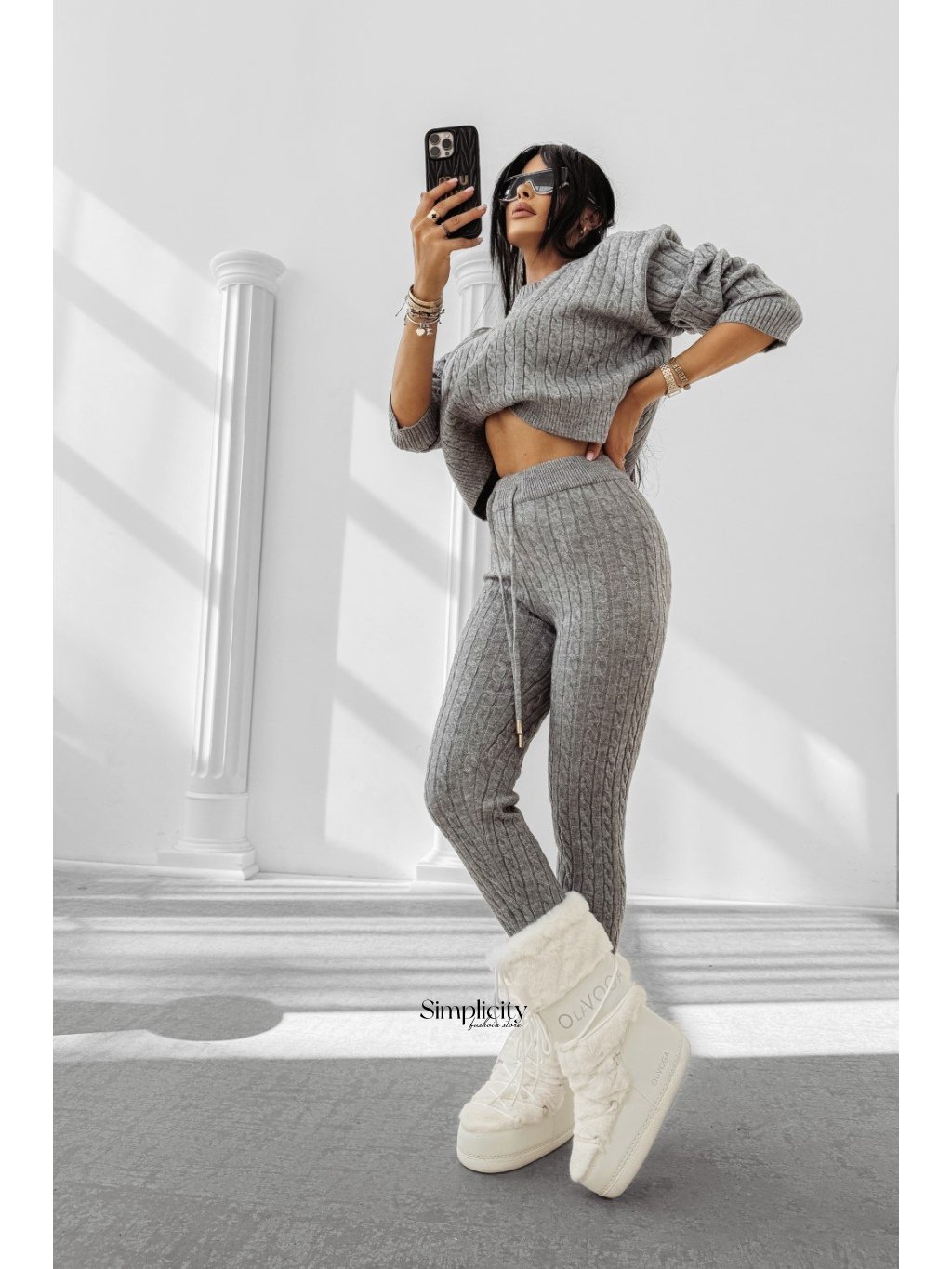 Kényelmes női szett puha kötött anyagból. Felső: kapucnis pulóver. Alsó: magas derekú nadrág. Elöl logónyomattal díszítve, amely sportos és modern karaktert ad.