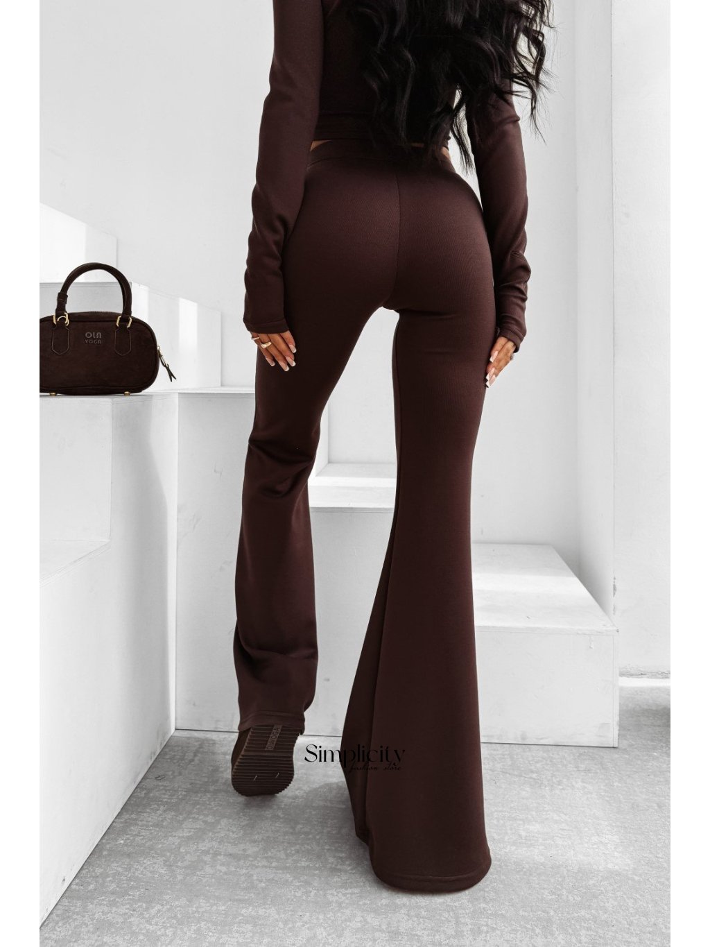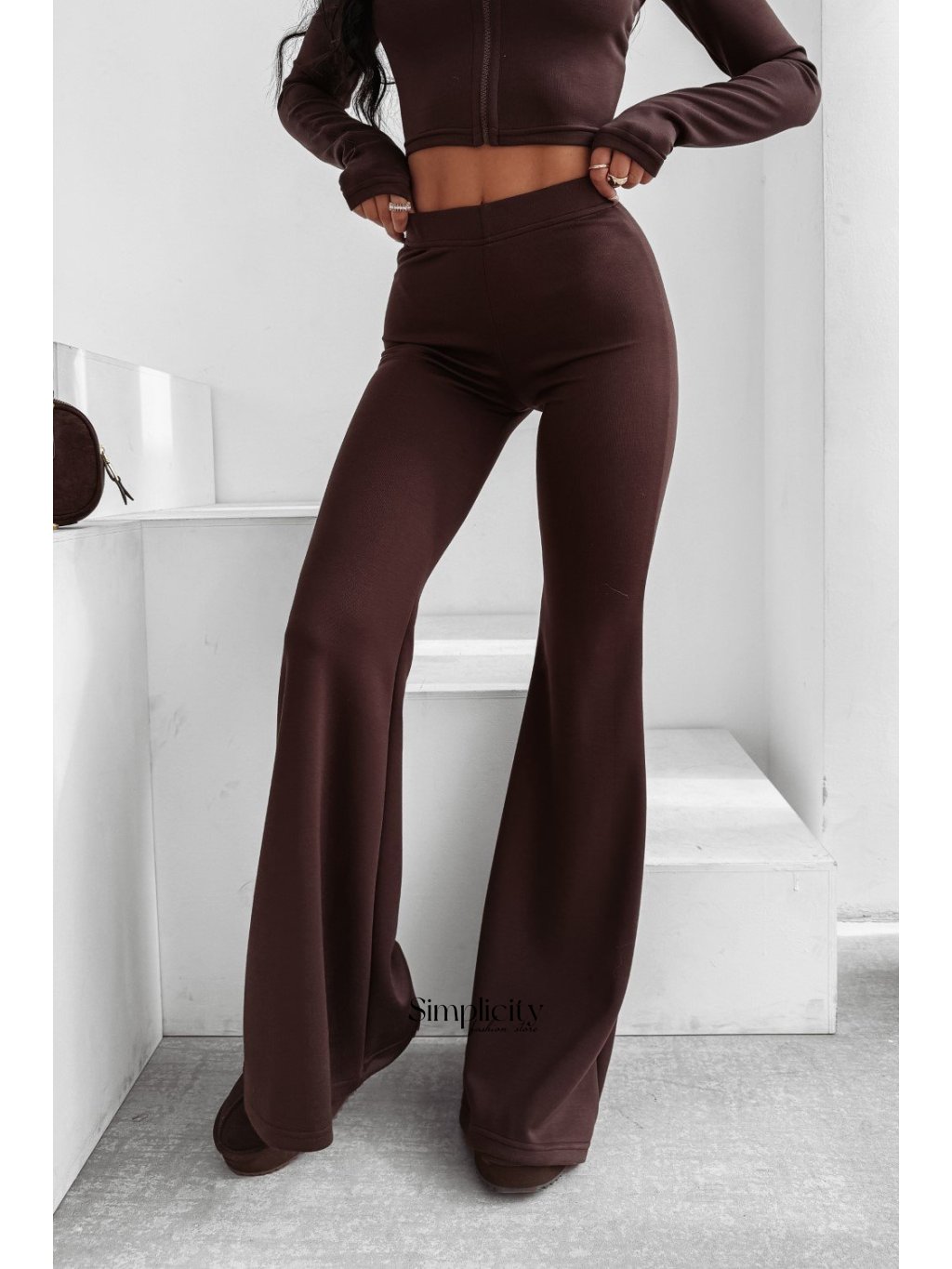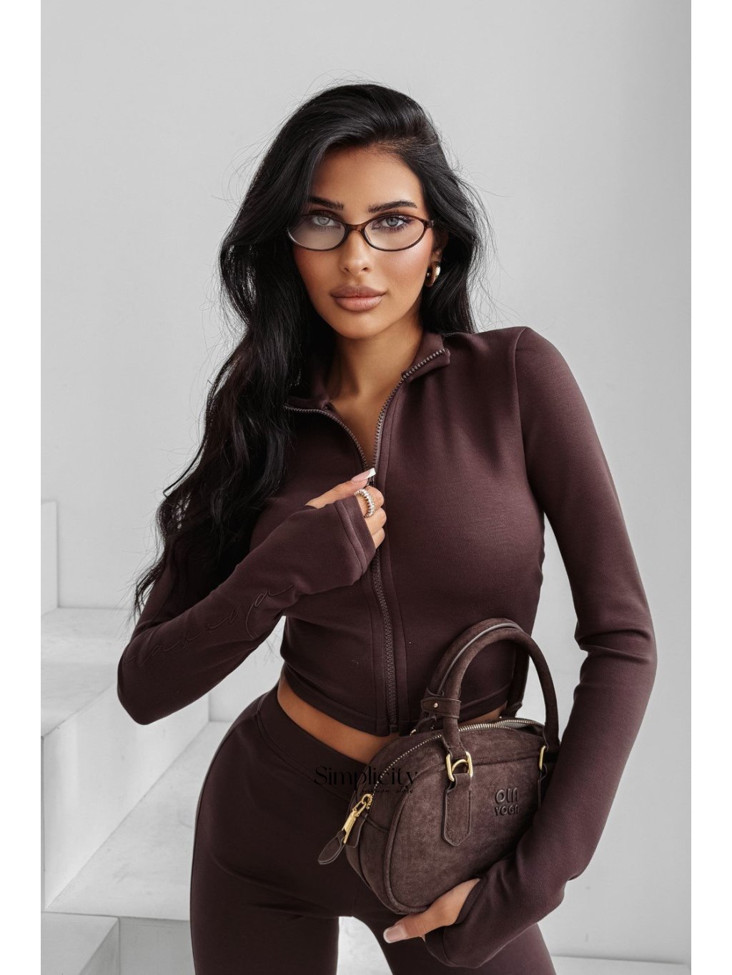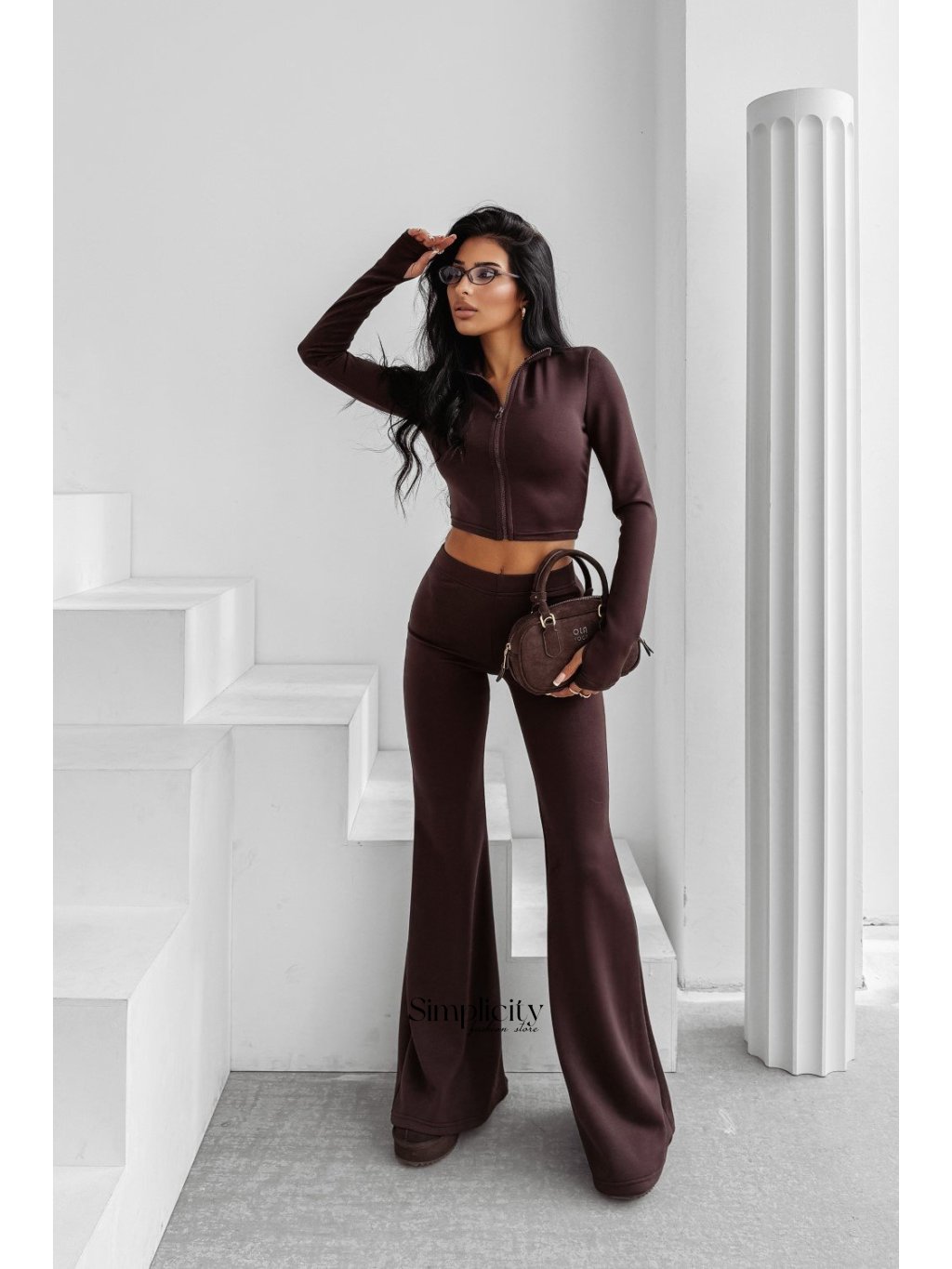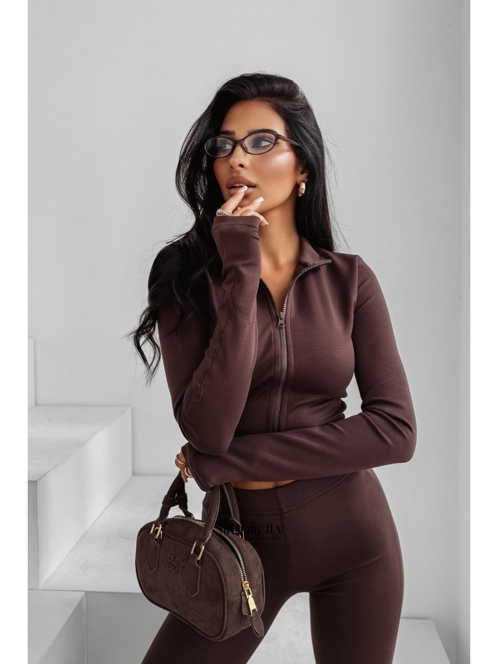 Dámsky set z prémiového, elastického materiálu. Priliehavý strih, ktorý zvýrazňuje postavu. Vrchný diel je rolák, spodný diel sú nohavice s vysokým pásom. Zdobený decentným logom.