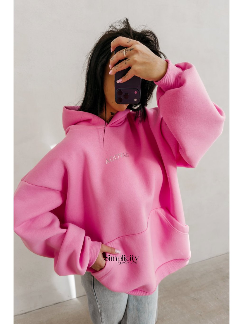 Táto nadrozmerná mikina s kapucňou je prémiovým kúskom streetwearu vďaka husto tkanej, mäkkej látke a výrazným krištáľovým ozdobám na chrbte.