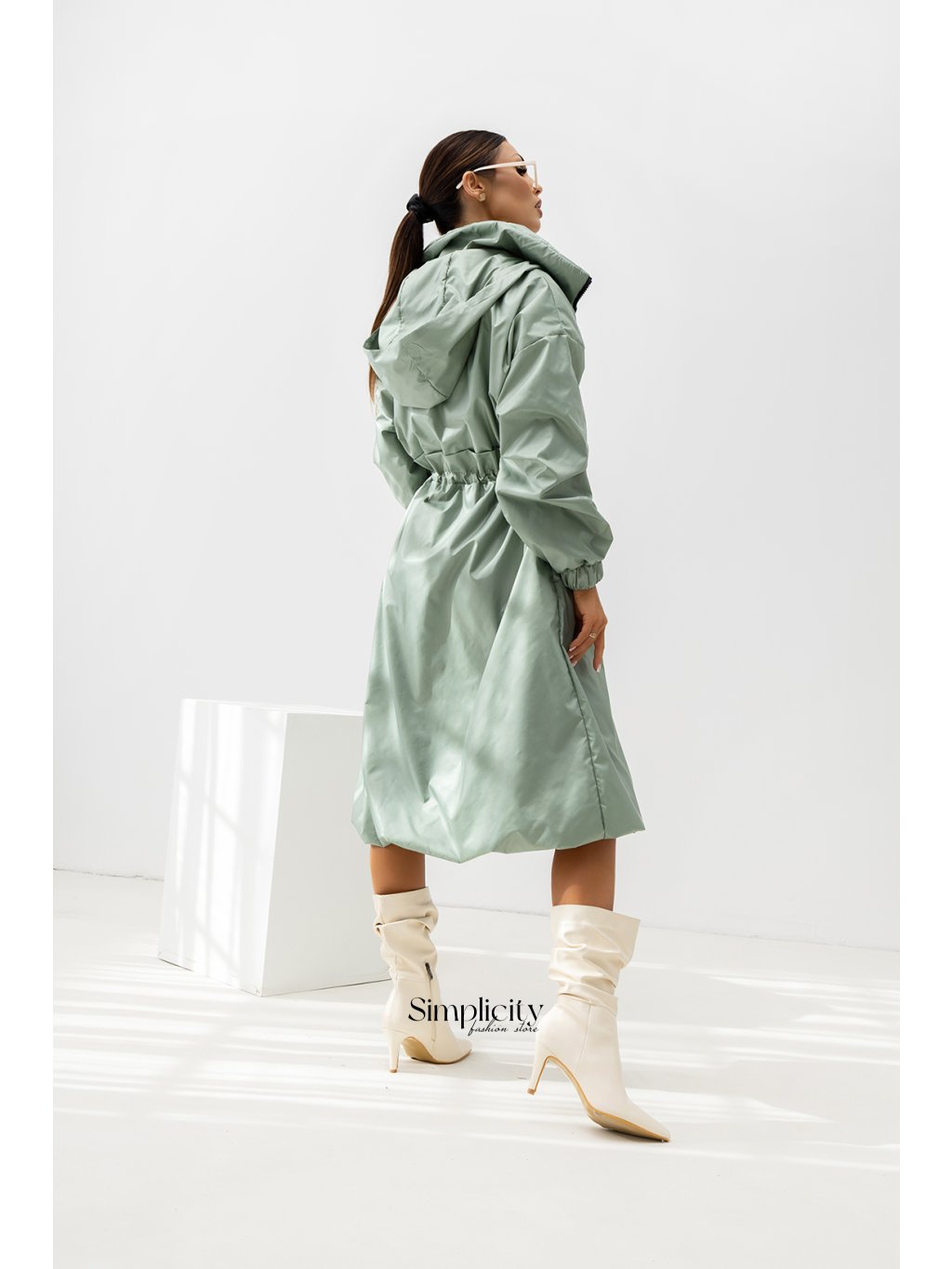 Plášť má praktický zips po celej dĺžke. Charakteristickým znakom tohto modelu je nastaviteľný pás so sťahovacou šnúrkou. To umožňuje prispôsobiť ho postave, zvýrazniť ženské krivky a zároveň zaistiť pohodlie.