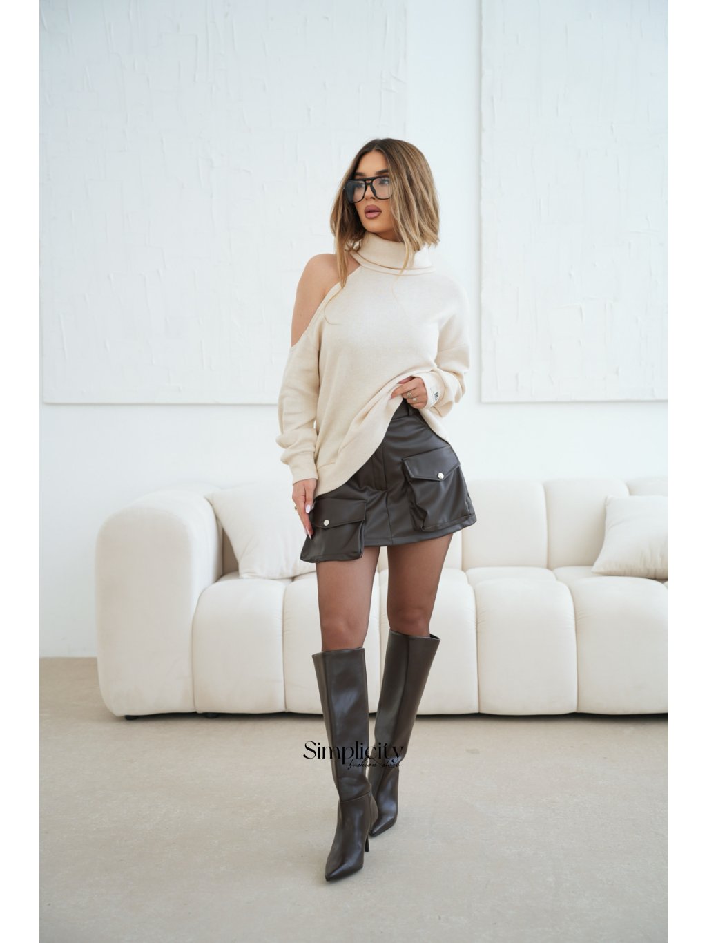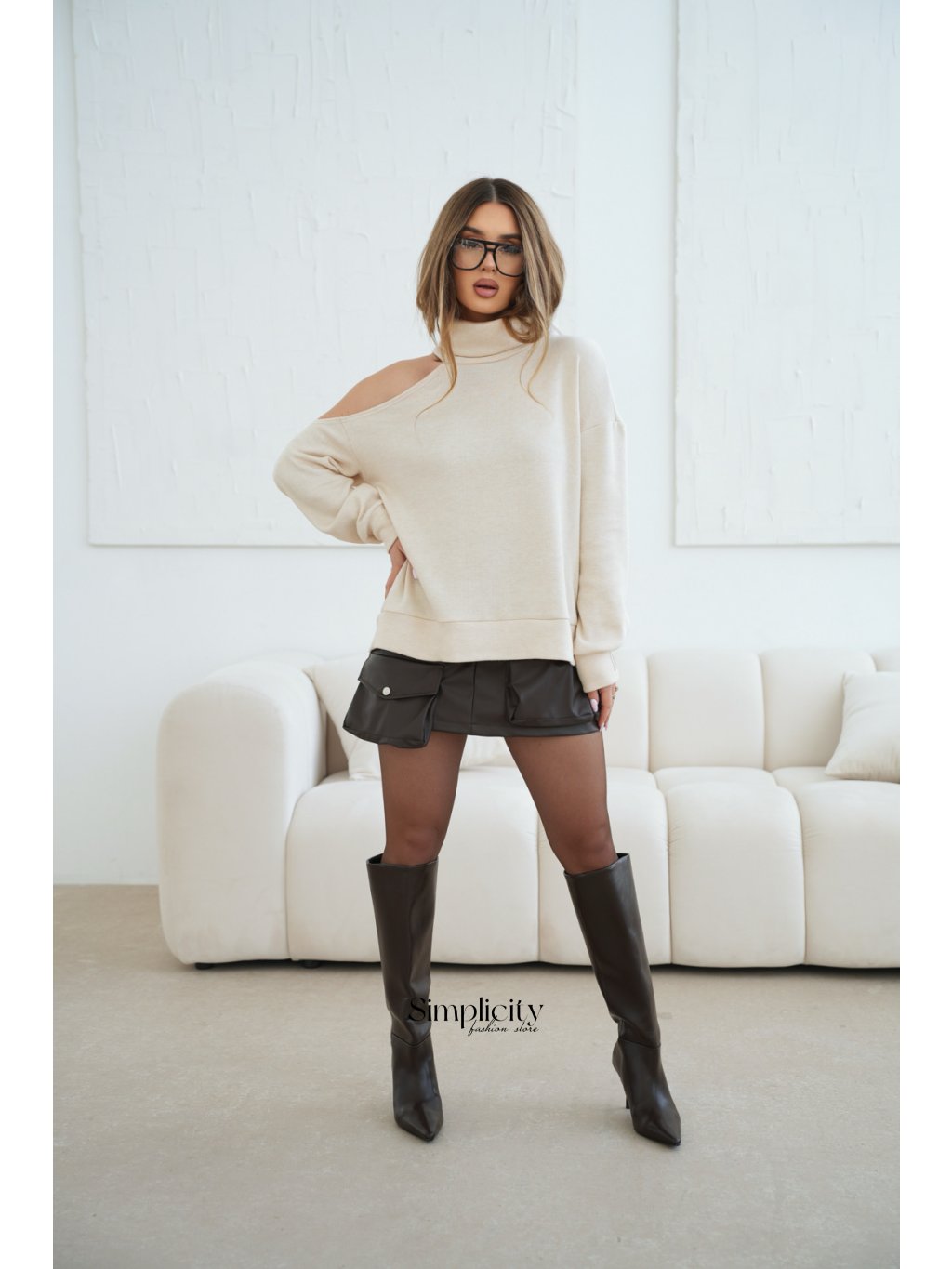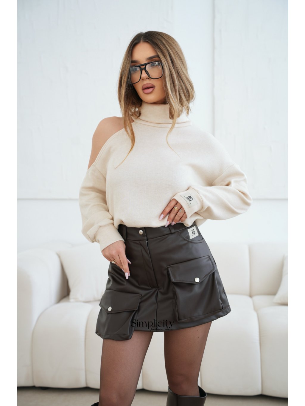 Tento asymetrický dámsky sveter kombinuje eleganciu s ležérnym vzhľadom vďaka mäkkému úpletu a módnemu výstrihu na ramenách. Sveter je navyše ozdobený nášivkou s logom BG Brandenburg Couture na ľavej manžete.