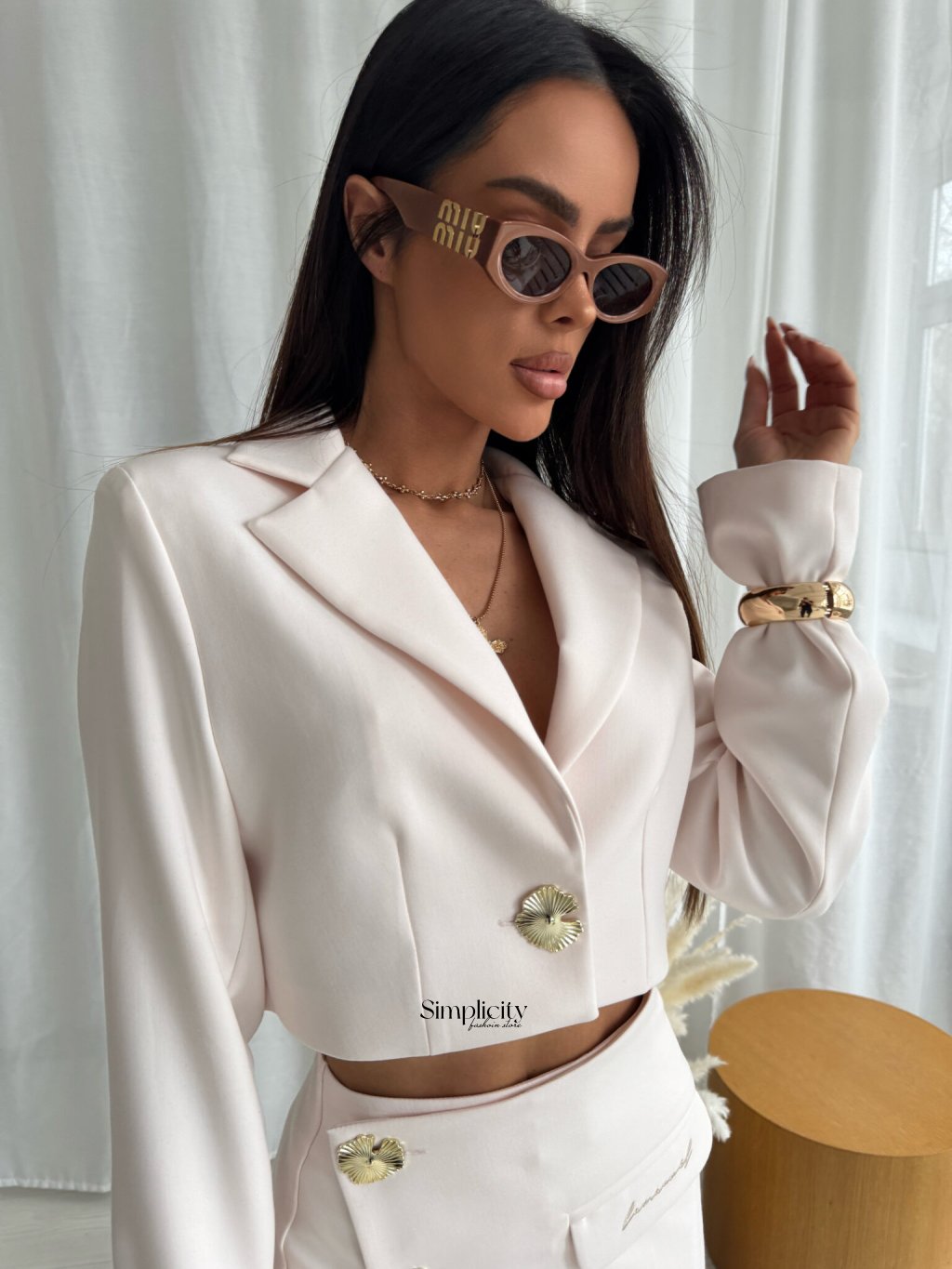 Krátka, elegantná dámska bunda s priliehavým strihom. Model s klasickým golierom a dlhými rukávmi, zapínaný ozdobným gombíkom. Vyrobené z hladkého materiálu, ktorý dobre sedí na postave. Ideálne na večerný styling, ale bude sa hodiť aj k džínsom.