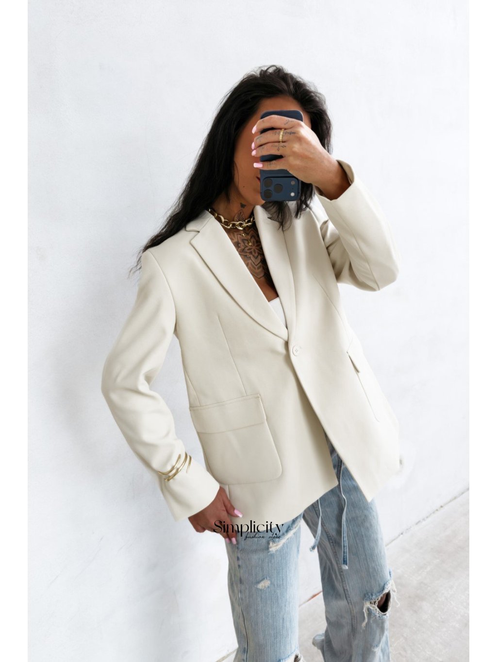 Strih: Moderný, mierne nadrozmerný strih, ktorý je pohodlný aj štýlový zároveň.Detaily: Zapínanie na jeden gombík, klasický golier a klopy a elegantné vrecká s klopou vpredu.