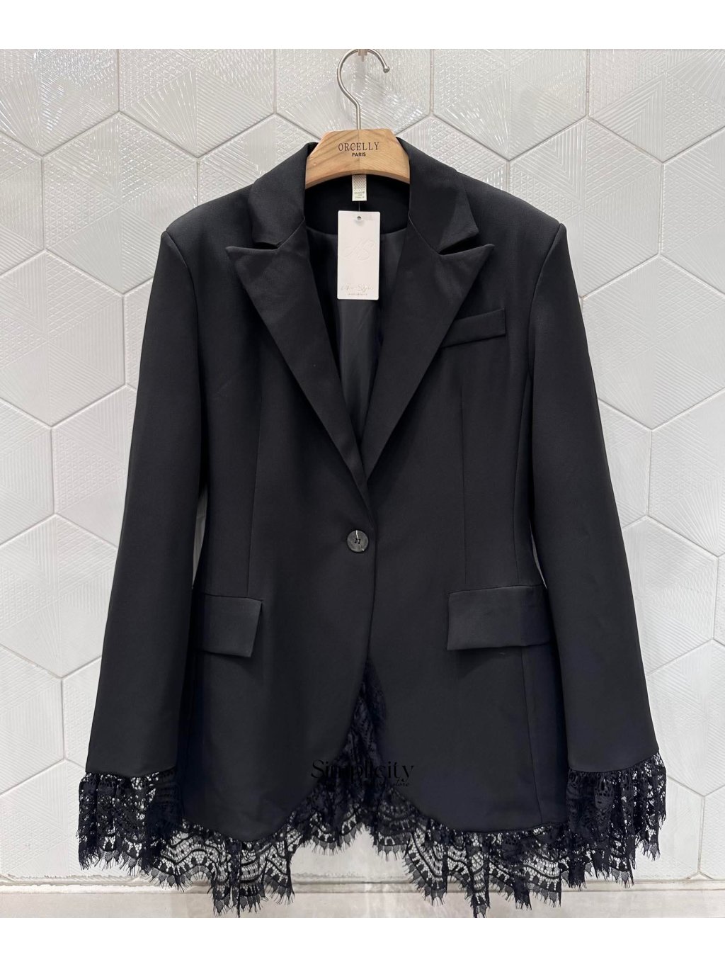 Sako tvarovaného strihu doplnené lemovaním krajkou.