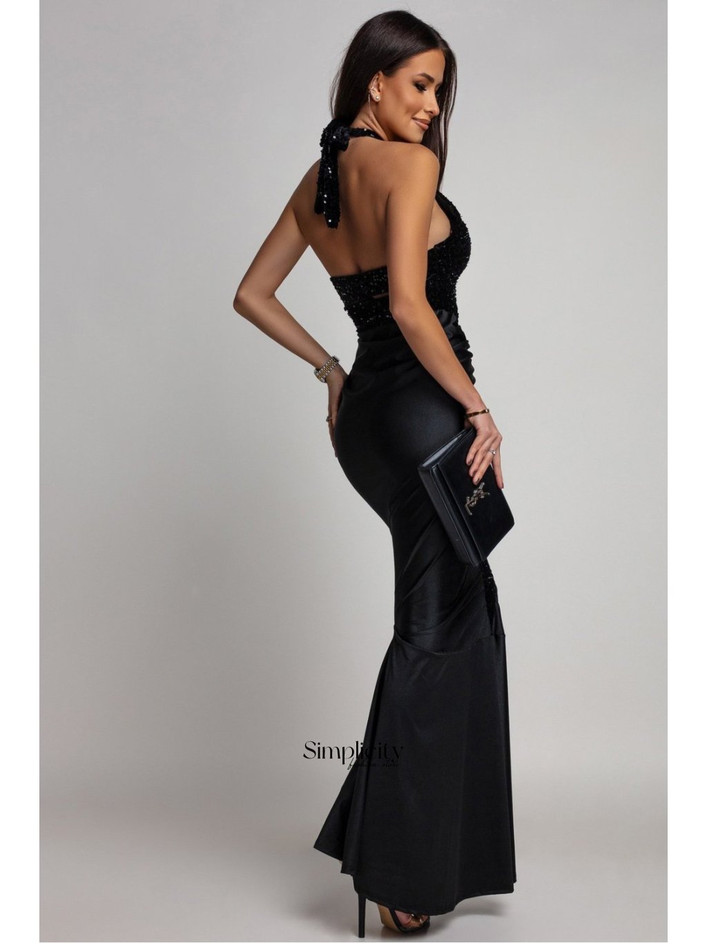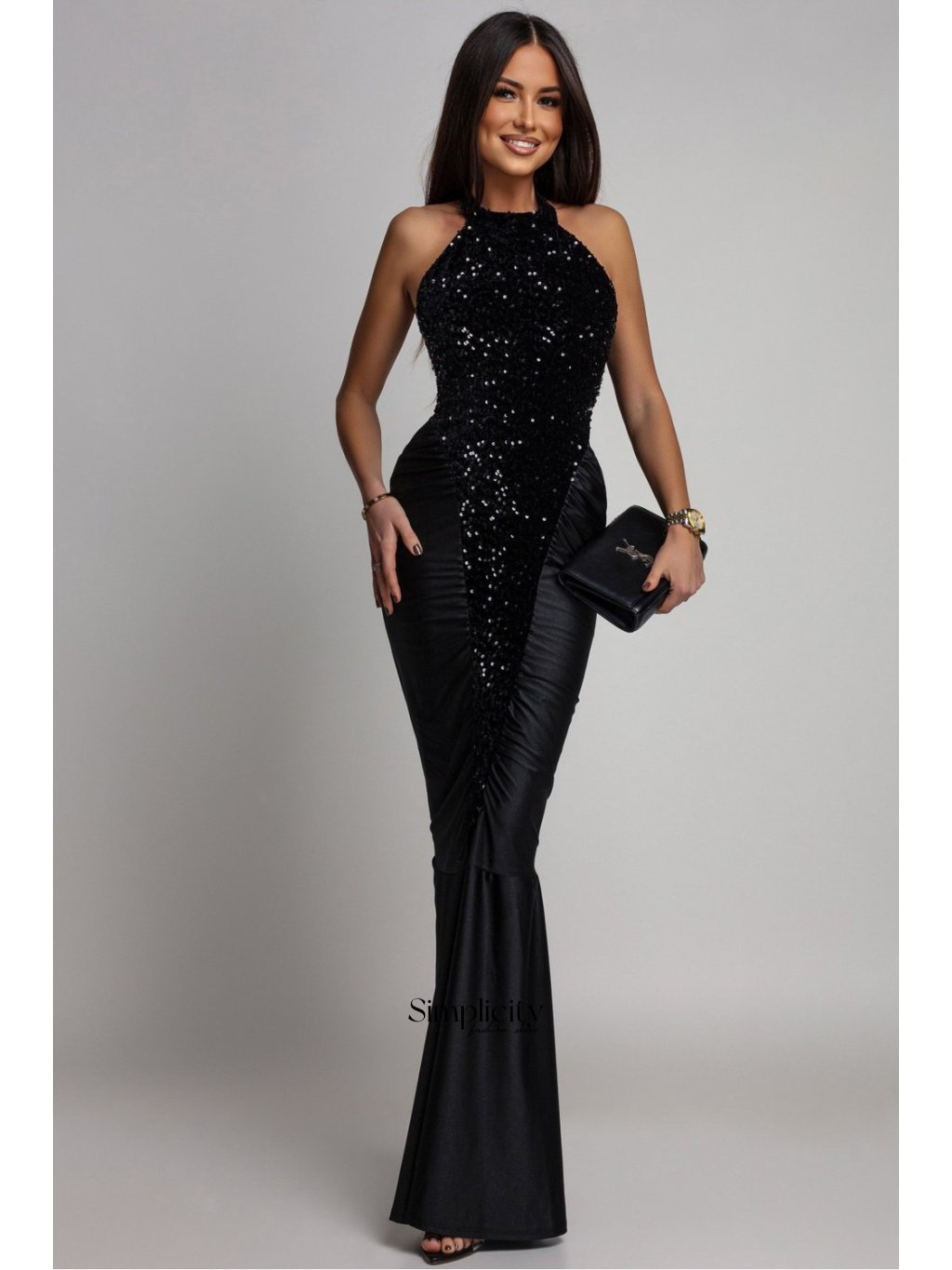 Dlhé, flitrované ležérne šaty. Priliehavý strih a skladané bočné panely šiat krásne zvýrazňujú postavu, zatiaľ čo trblietavá vsadka vytvára skutočne večerný vzhľad.