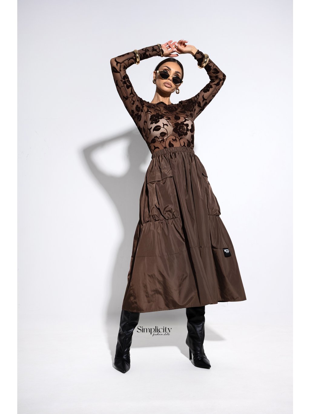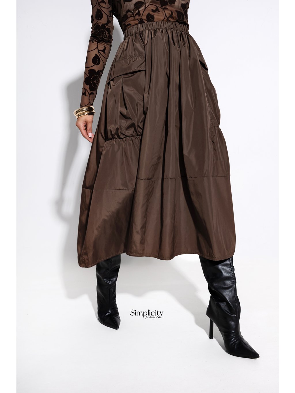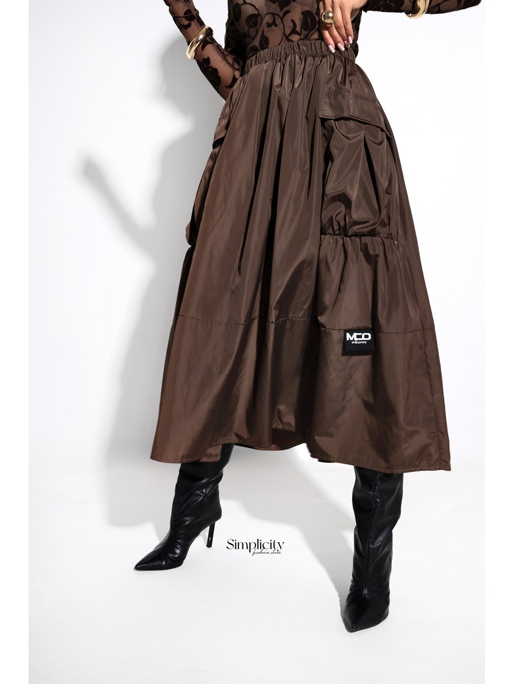 Siaha až po členky a vytvára výraznú, predĺženú siluetu. Materiál je mierne pevný a mierne lesklý, čo dodáva kúsku športový, technický vzhľad inšpirovaný úžitkovým a streetwear štýlom. Najvýraznejším prvkom je bočné vrecko, ktoré dodáva sukni objem.