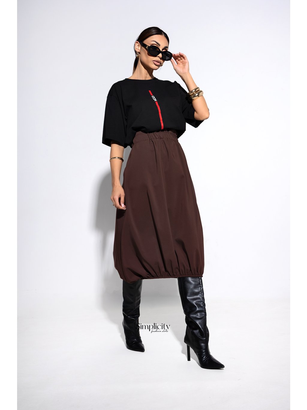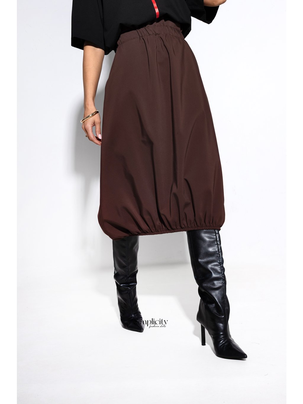 Kľúčovým prvkom tejto sukne je guma všitá do lemu, ktorá jemne sťahuje látku k sebe a vytvára zaoblený, mierne balónovitý tvar.