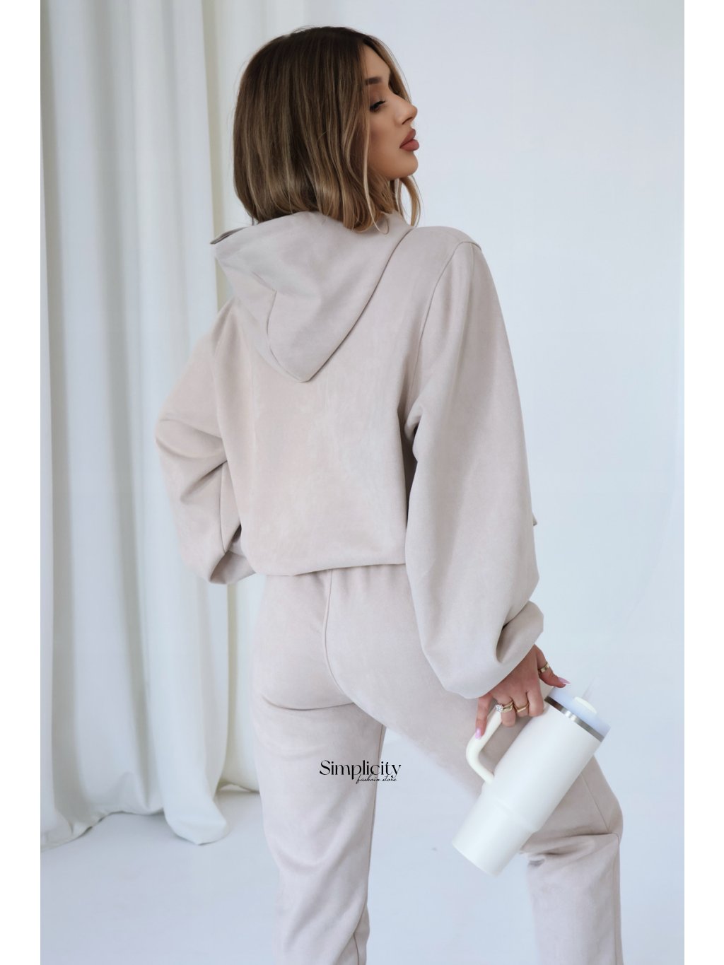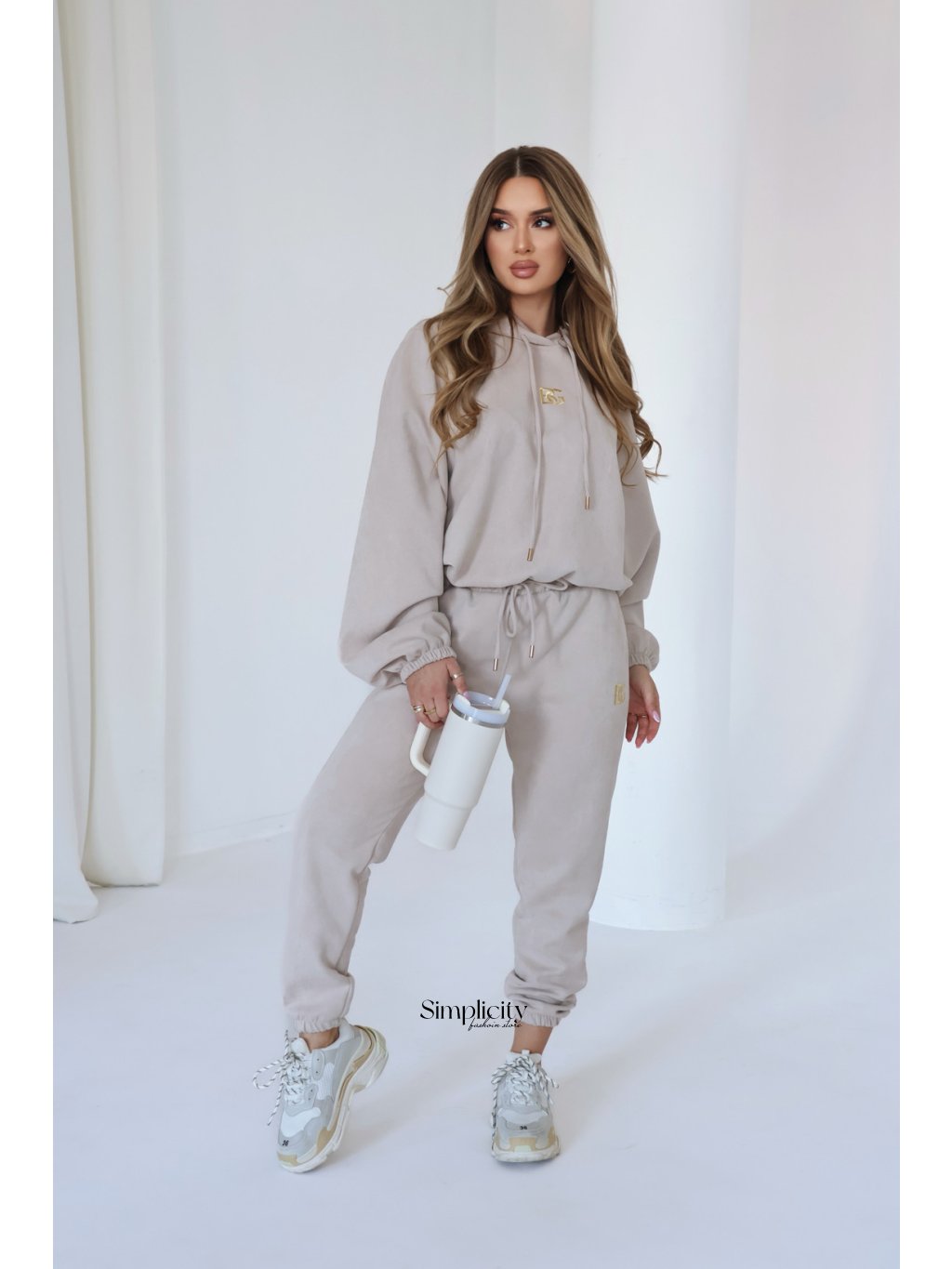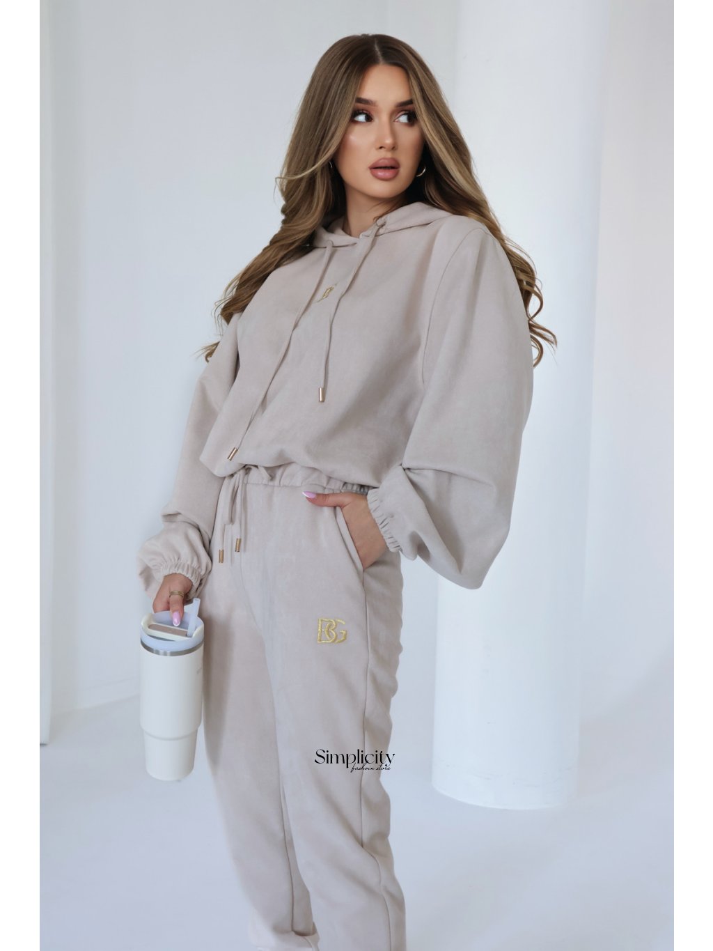 Semišová tepláková súprava BG EMU. Mikina a nohavice majú zlatú výšivku BG a sťahovacie šnúrky na kapucni a v páse. Tepláková súprava je zakončená elastickými manžetami.