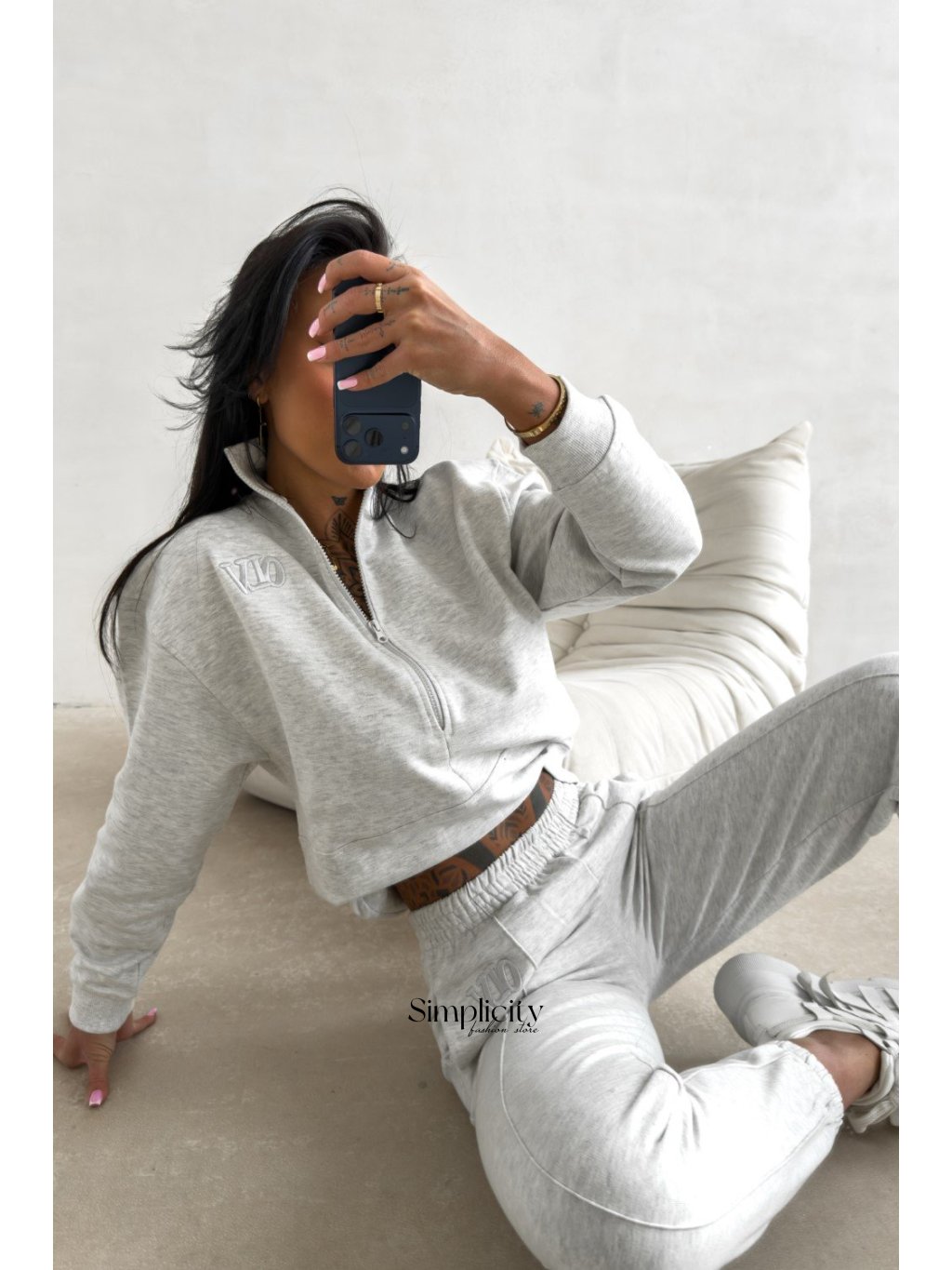 Vrchná časť (sveter): Voľný, oversized strih so zdvihnutým golierom na zips. Na prednej strane je viditeľná diskrétna výšivka OLV . Skutočným vrcholom svetra je zadná strana: veľkolepá trojrozmerná 3D výšivka „OLV“ , ktorá je umiestnená na jemnej, tónovej potlači „OLAVOGA“.
