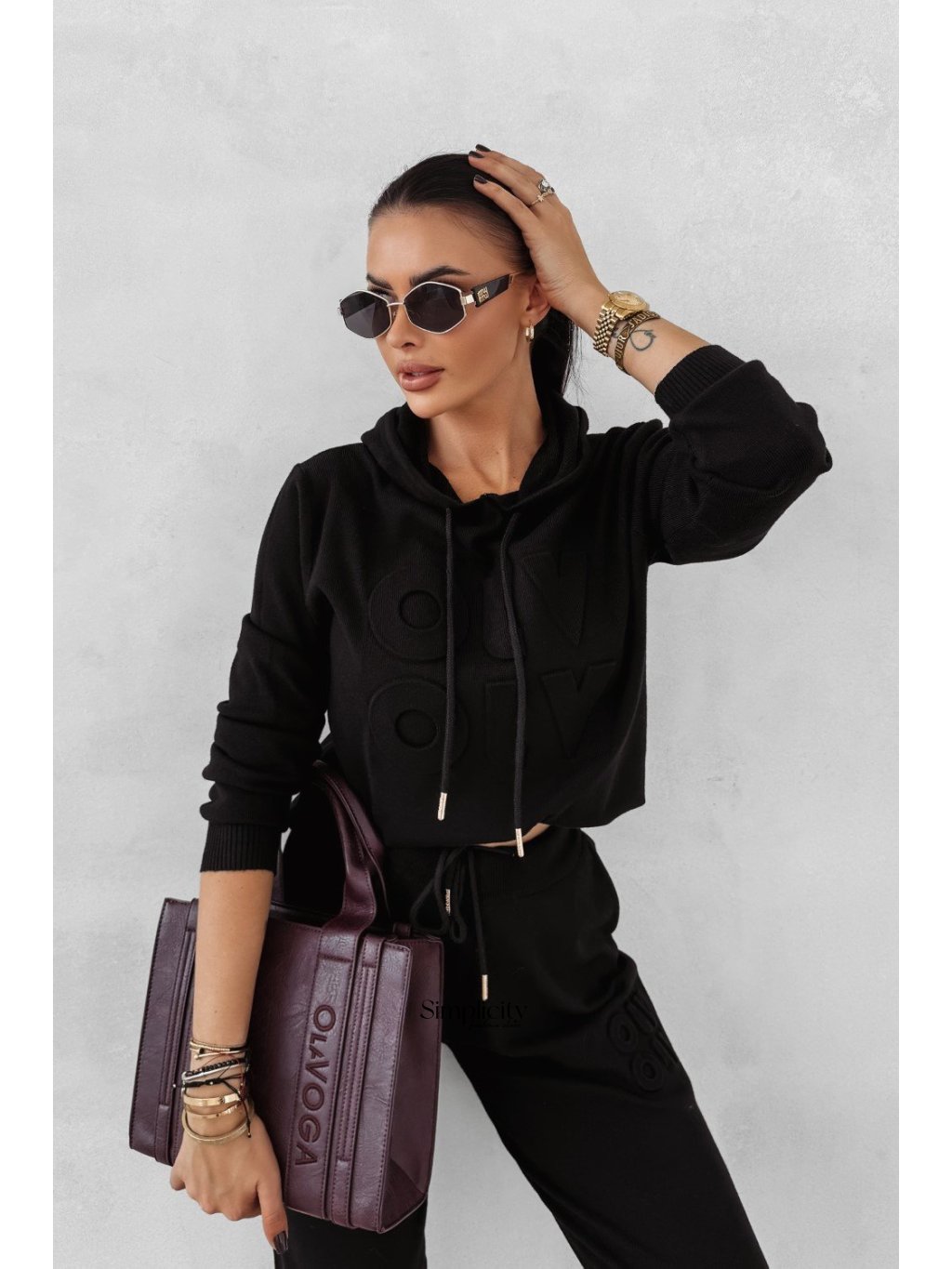 Dámsky športový set, ktorý je pohodlný a štýlový na každodenné nosenie. Vyrobený z mäkkej, elastickej látky. Vrchný diel tvorí top s kapucňou a potlačou loga vpredu a spodný diel tvoria nohavice s vysokým pásom a vreckami. Ideálny na tréning alebo na ležérnejšie dni.