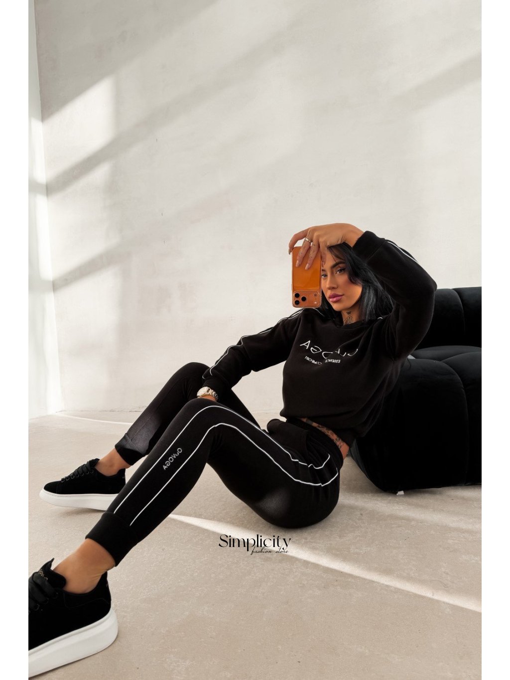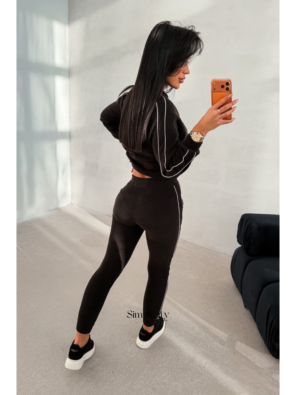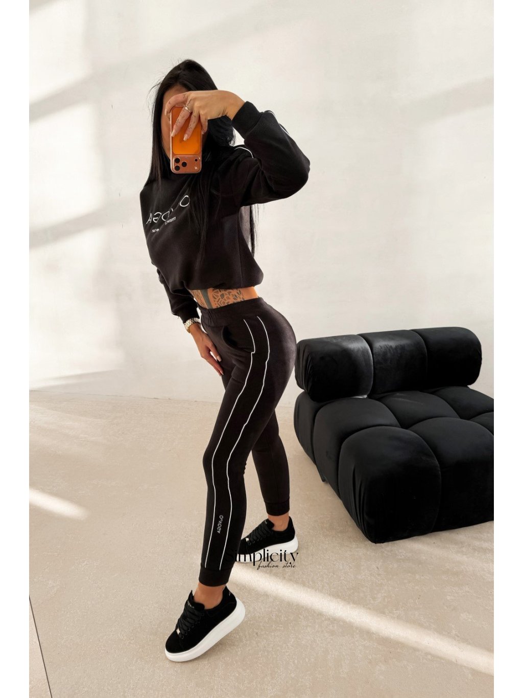 Spodná časť: Nohavice s elastickým pásom, bočnými vreckami a štýlovým zadným švom , ktorý dodáva strihu extra charakter.