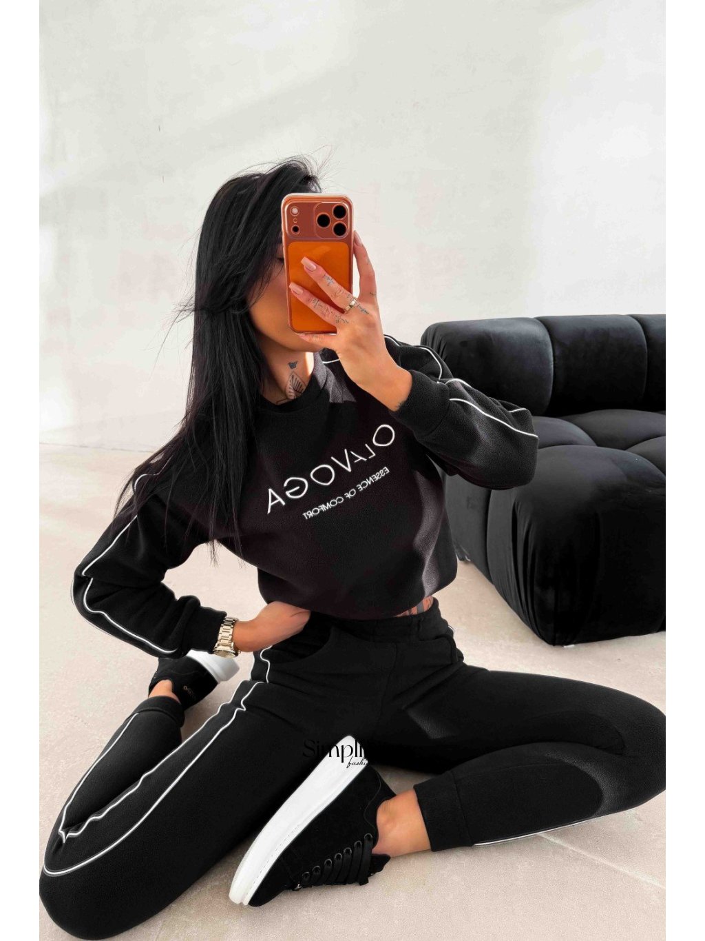 Vrch: Sveter s okrúhlym výstrihom a elastickými manžetami. Vpredu vyrazené logo OLAVOGA a nápis „ESSENCE OF COMFORT“, na rukávoch tenké kontrastné pruhy.