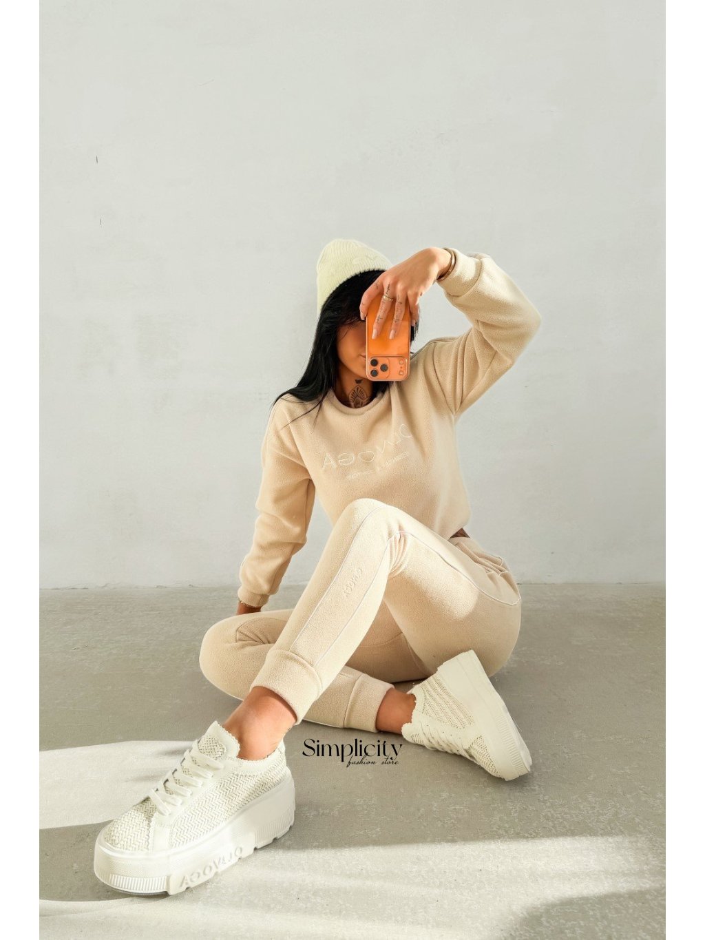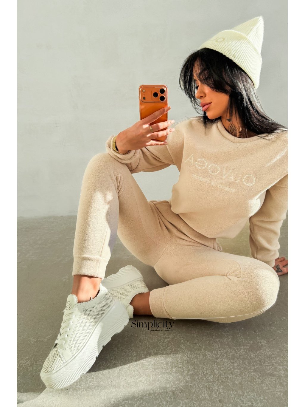 Vrch: Sveter s okrúhlym výstrihom a elastickými manžetami. Vpredu vyrazené logo OLAVOGA a nápis „ESSENCE OF COMFORT“, na rukávoch tenké kontrastné pruhy.