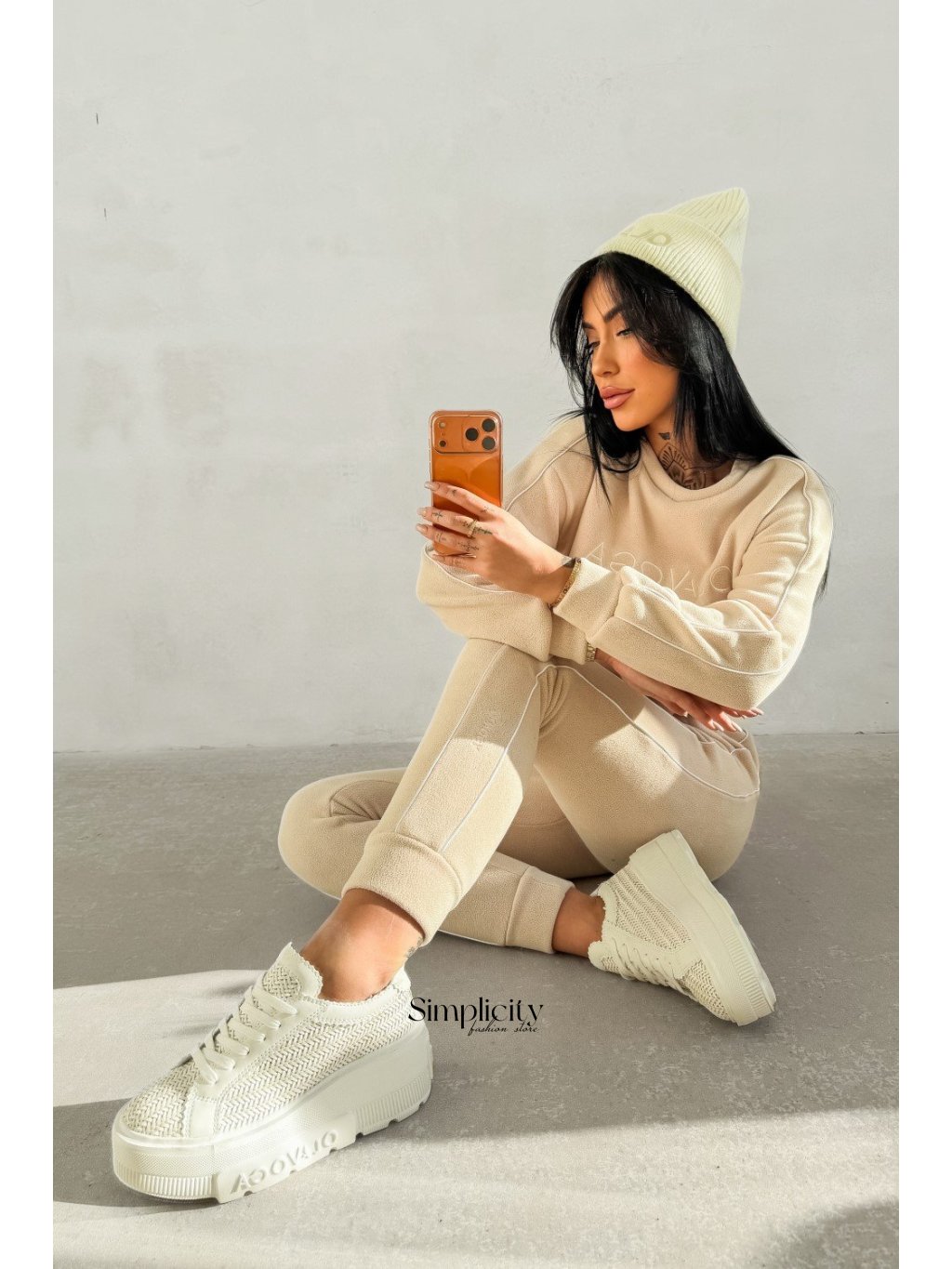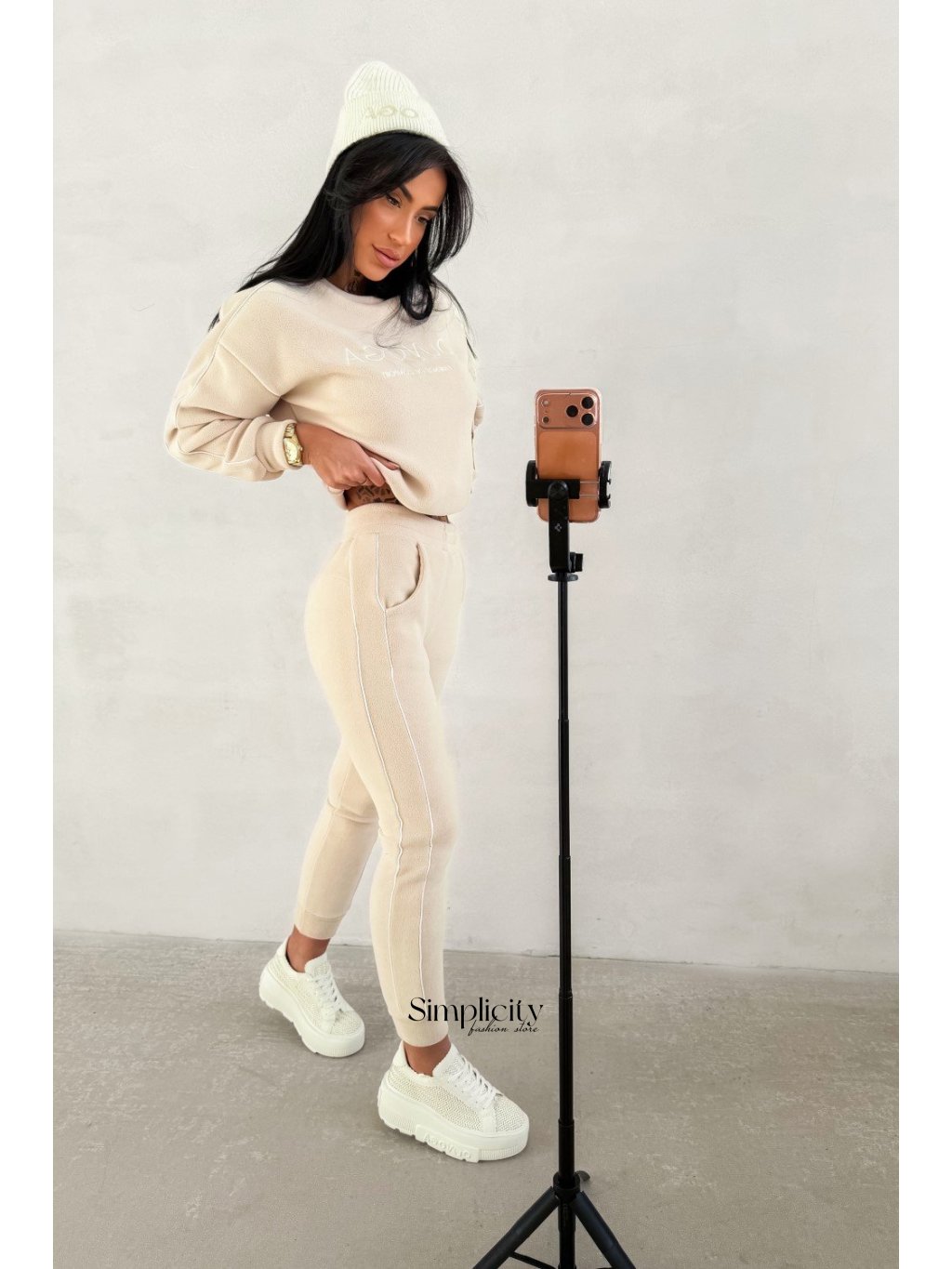 Spodná časť: Nohavice s elastickým pásom, bočnými vreckami a štýlovým zadným švom , ktorý dodáva strihu extra charakter.