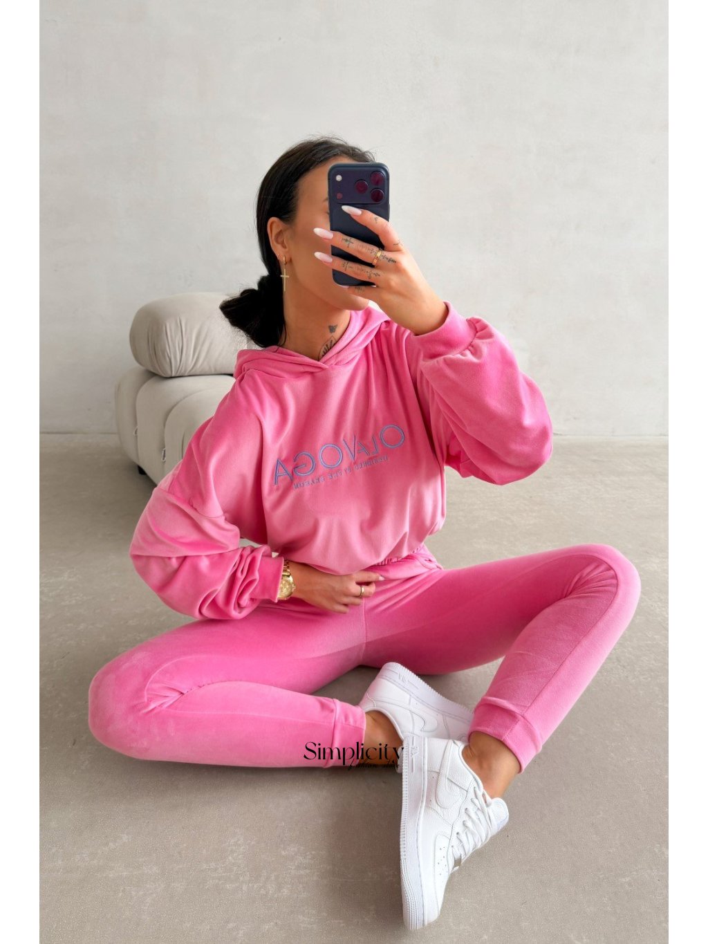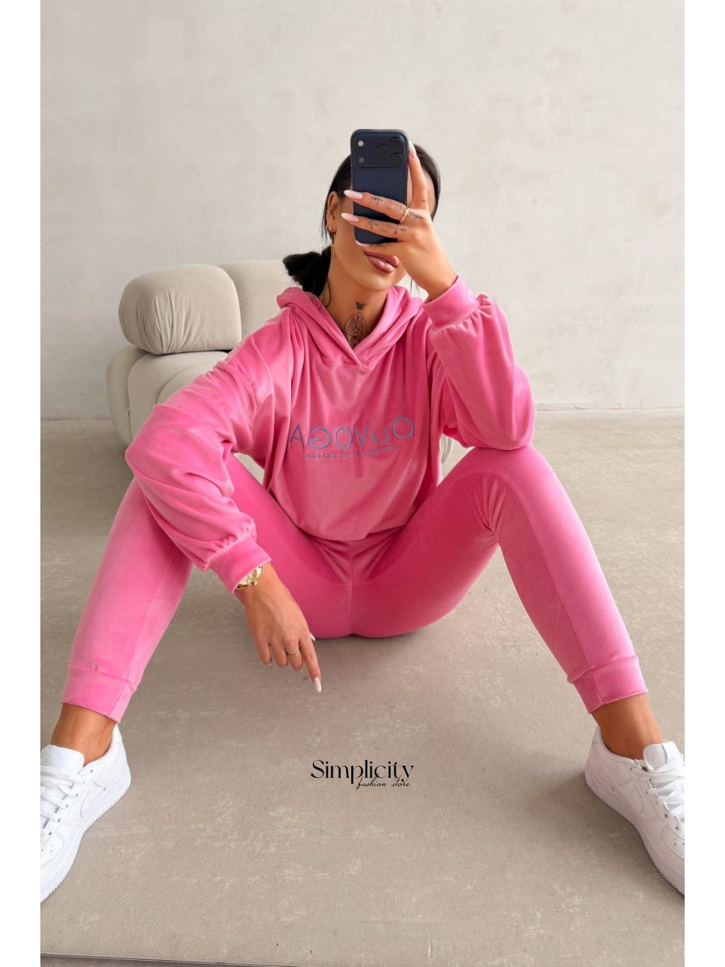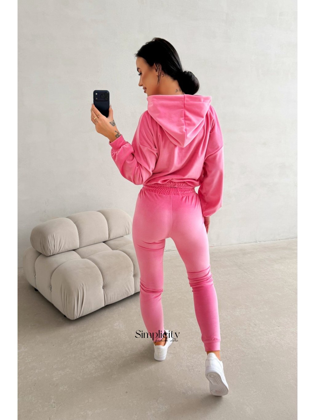 Spodná časť nohavíc končí priliehavým tvarom, ktorý zvýrazňuje tenisky.