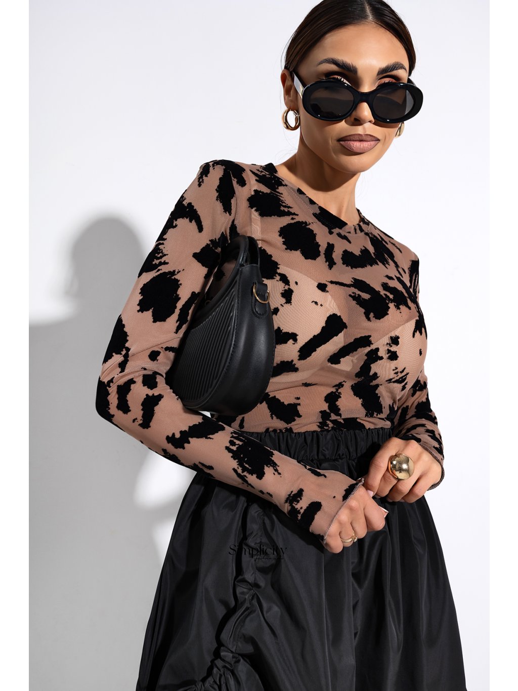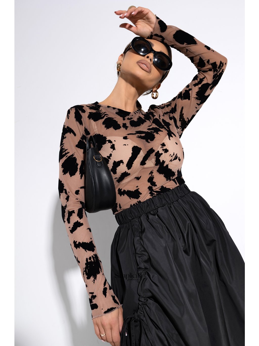 Jemná, polopriehľadná sieťovaná blúzka, ktorá nenápadne odhaľuje siluetu a púta pozornosť.