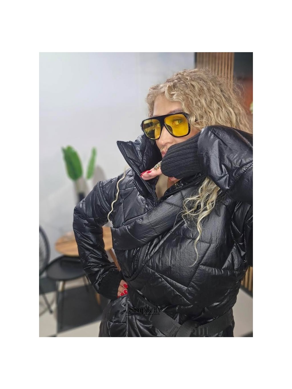 Extravagantný strih dopĺňa výrazný golier, ozvláštnený ozdobným prvkom ktorý sa dá odopnúť.